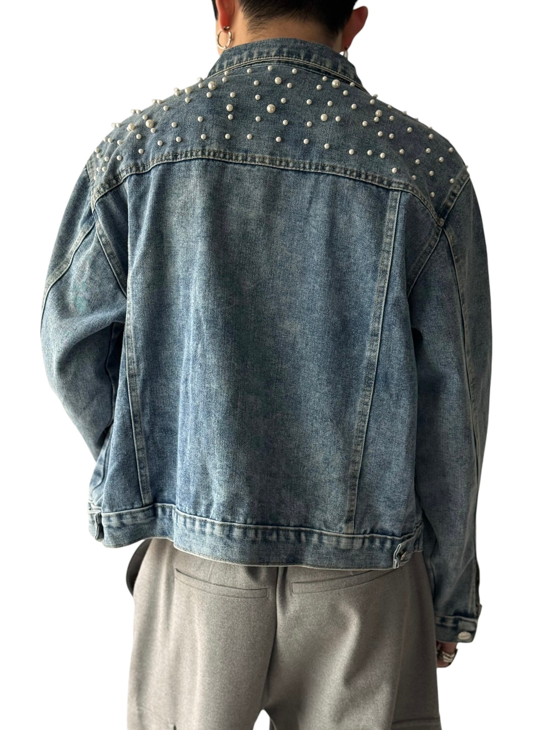 【Pnetty Robes】Faux pearl decorated washed denim tracker jacket