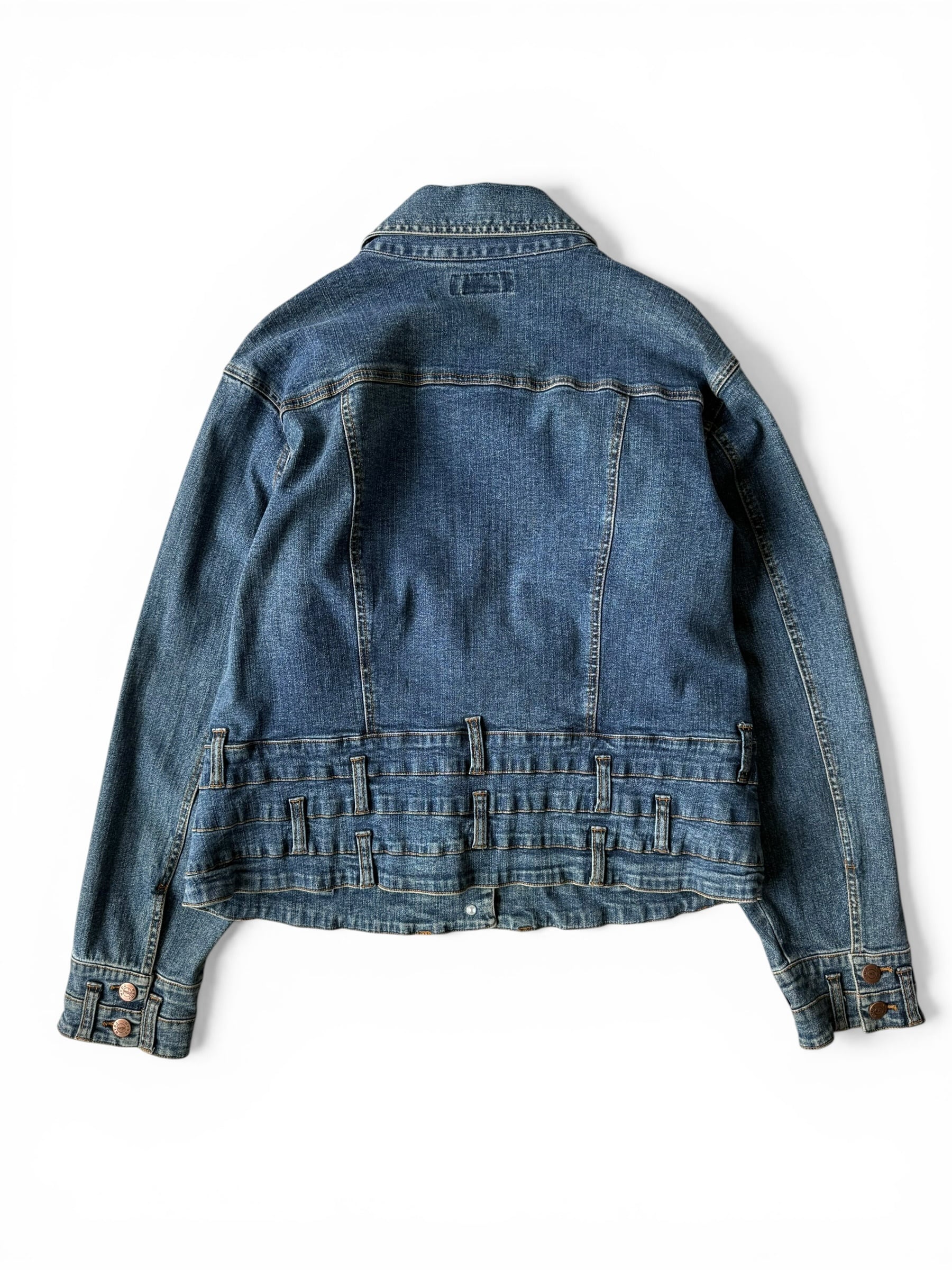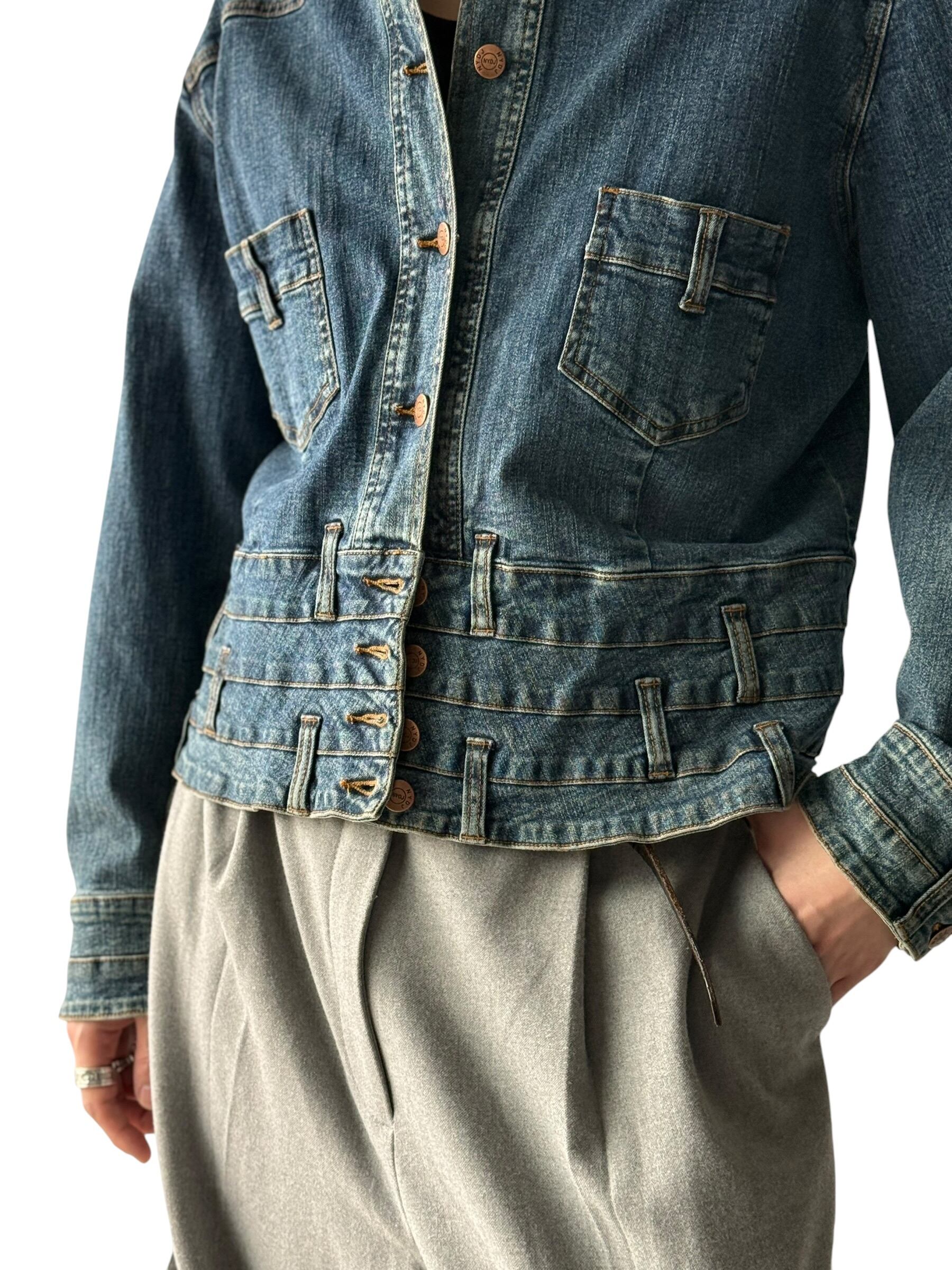 たくさんついたボタンやベルトループなどデニムパンツのパーツがドッキングしたような細かい仕様✨