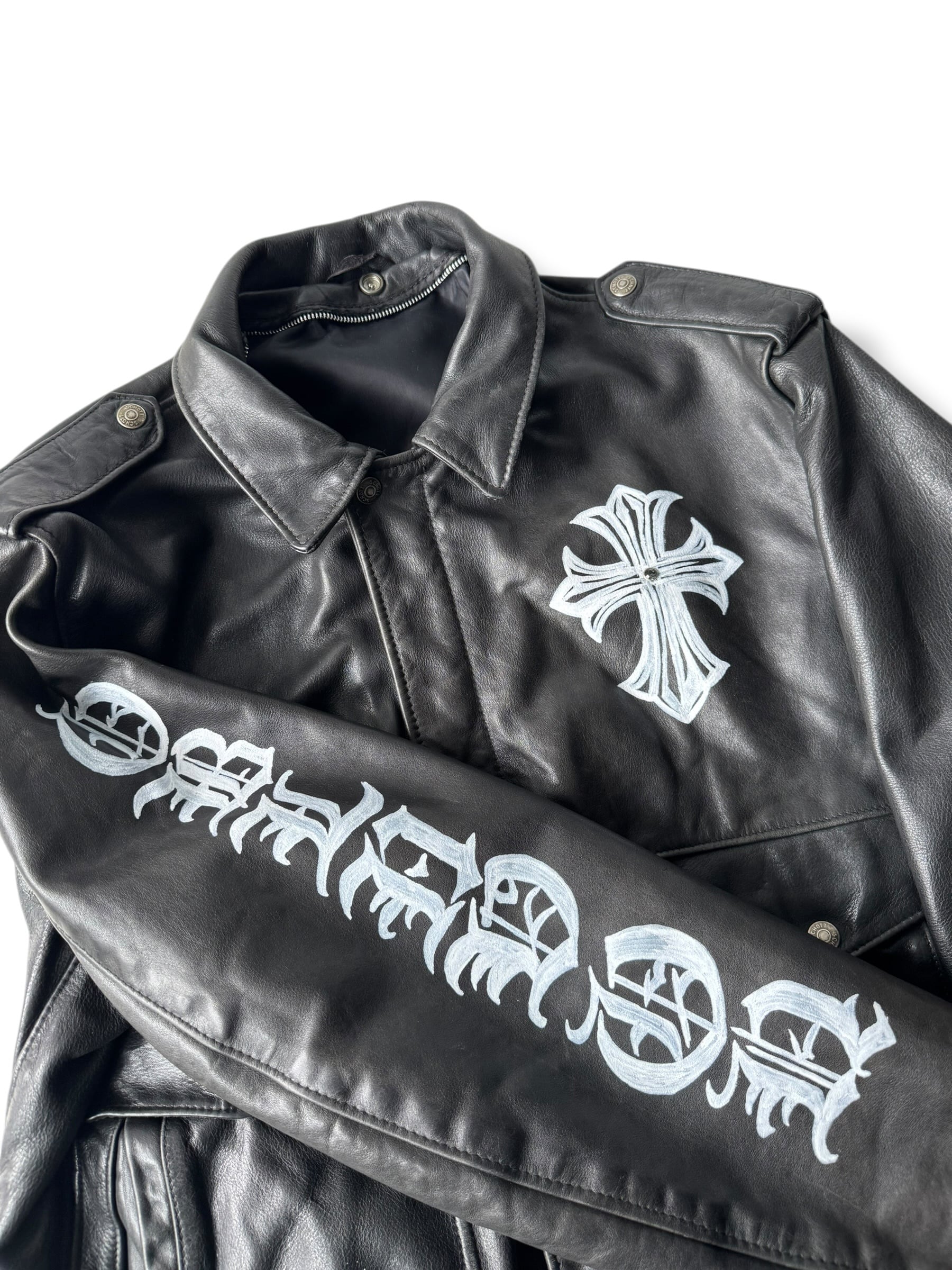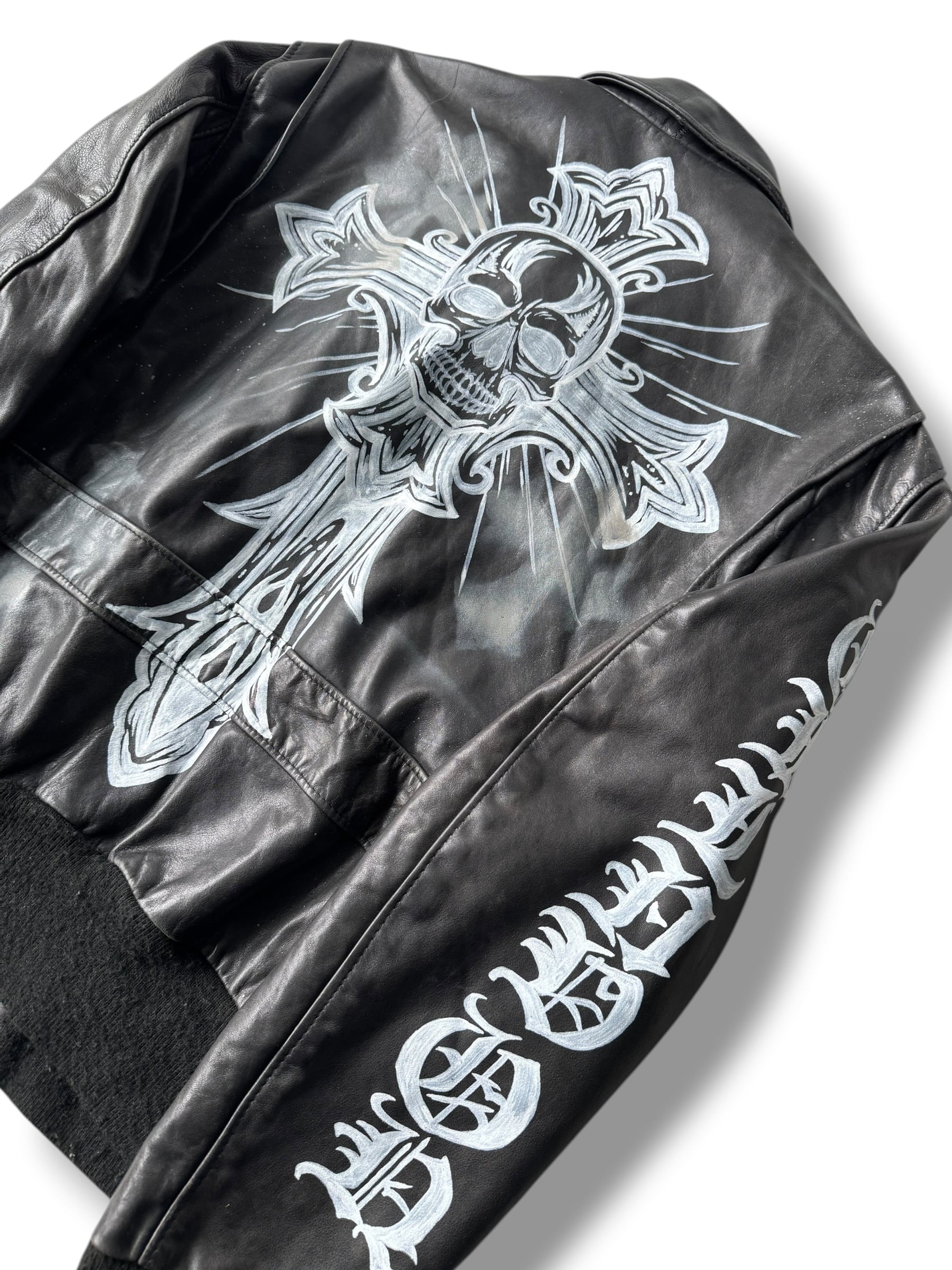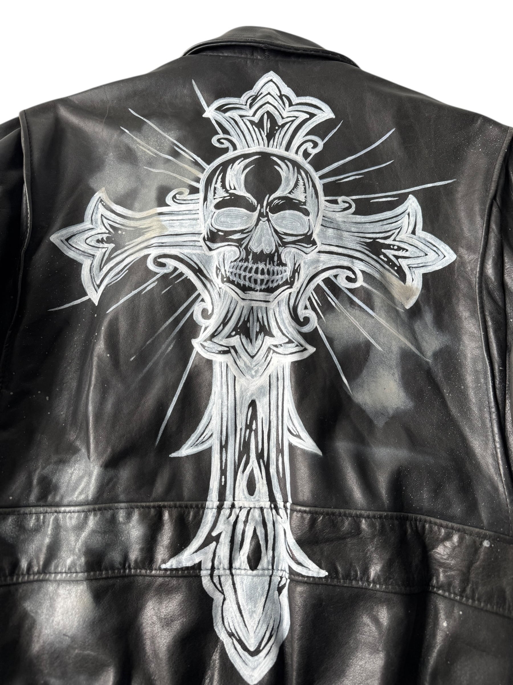 フロントにクロスモチーフ、片袖のオールドイングリッシュが雰囲気抜群で更には背面にスカルモチーフのビッグクロスがペイントされた存在感抜群すぎる仕様がワンアンドオンリー‼️‼️