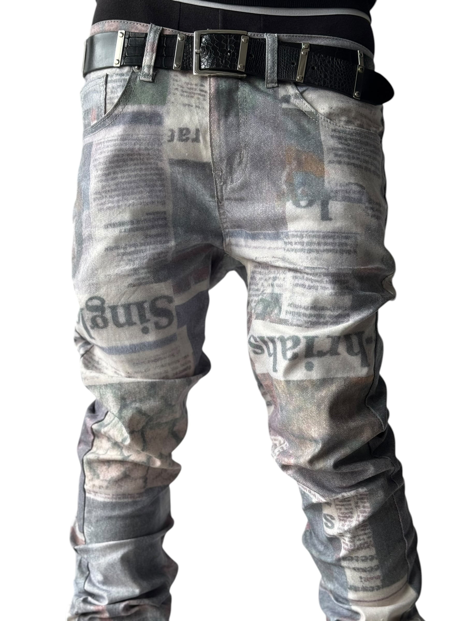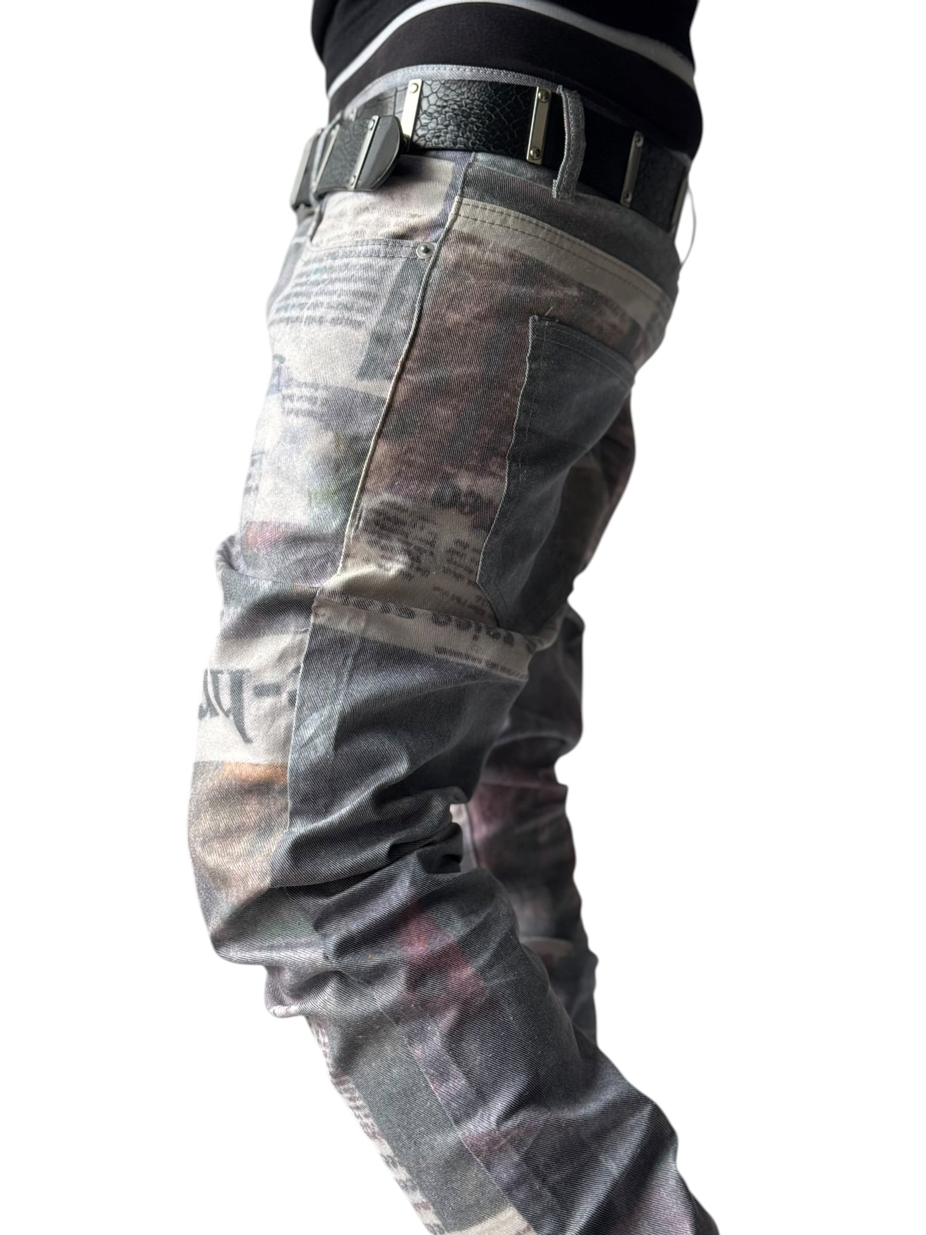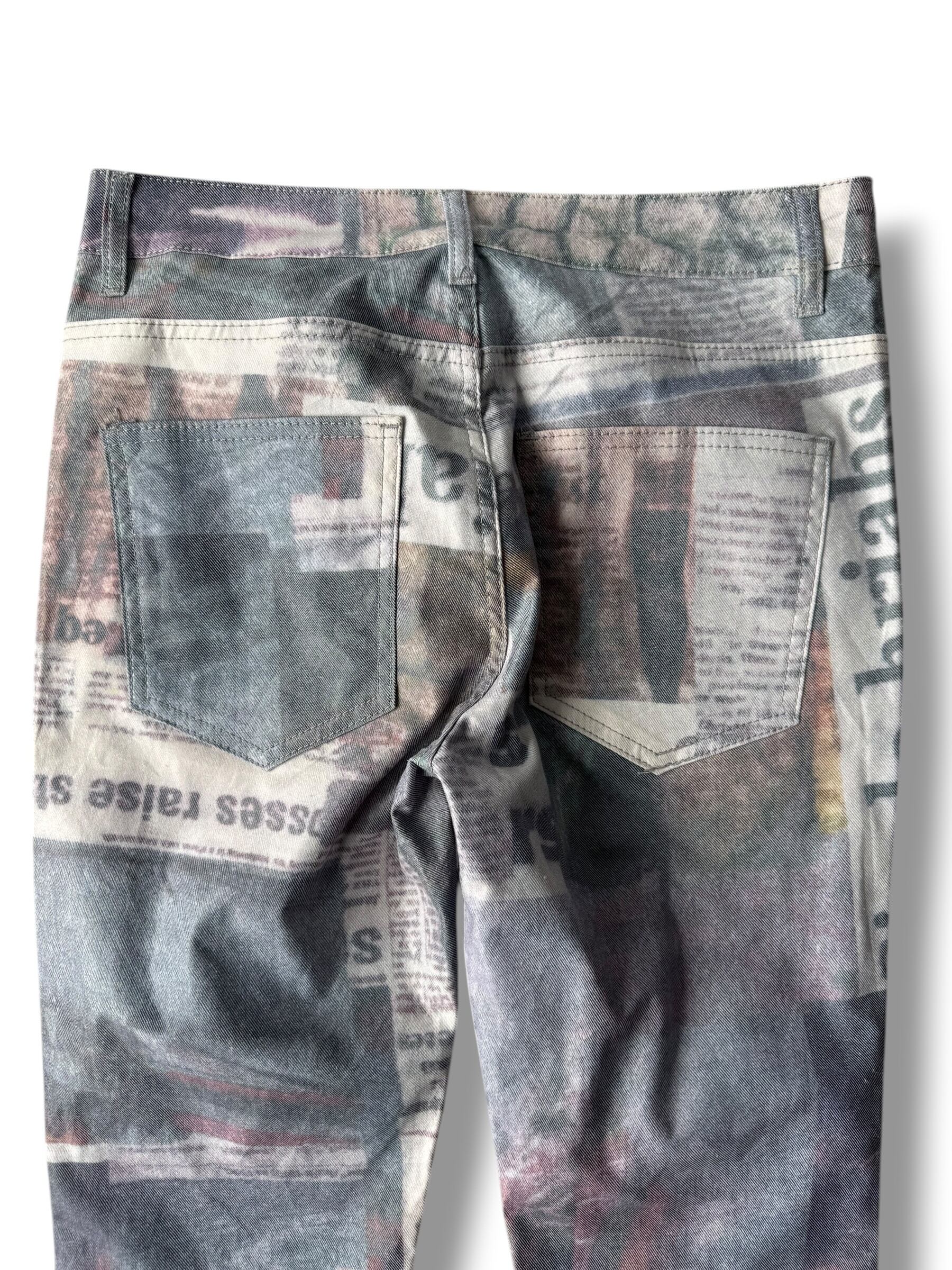 デザイナーズブランドによく使われるニュースペーパーデザインが転写されており、白黒が多いですが、なんとこのパンツはカラーが入った珍しいデザイン✨️✨️