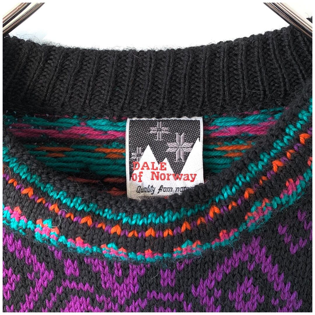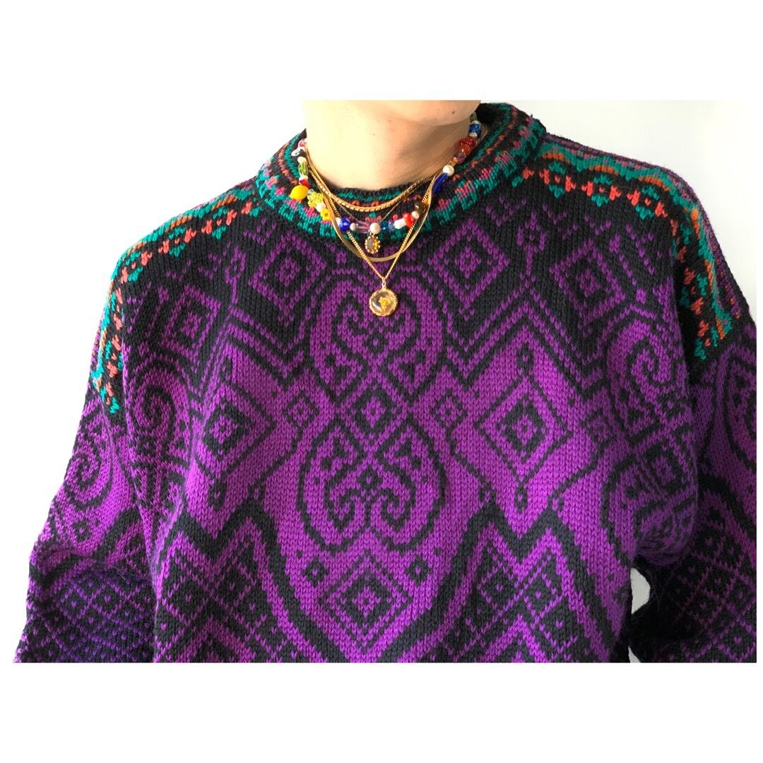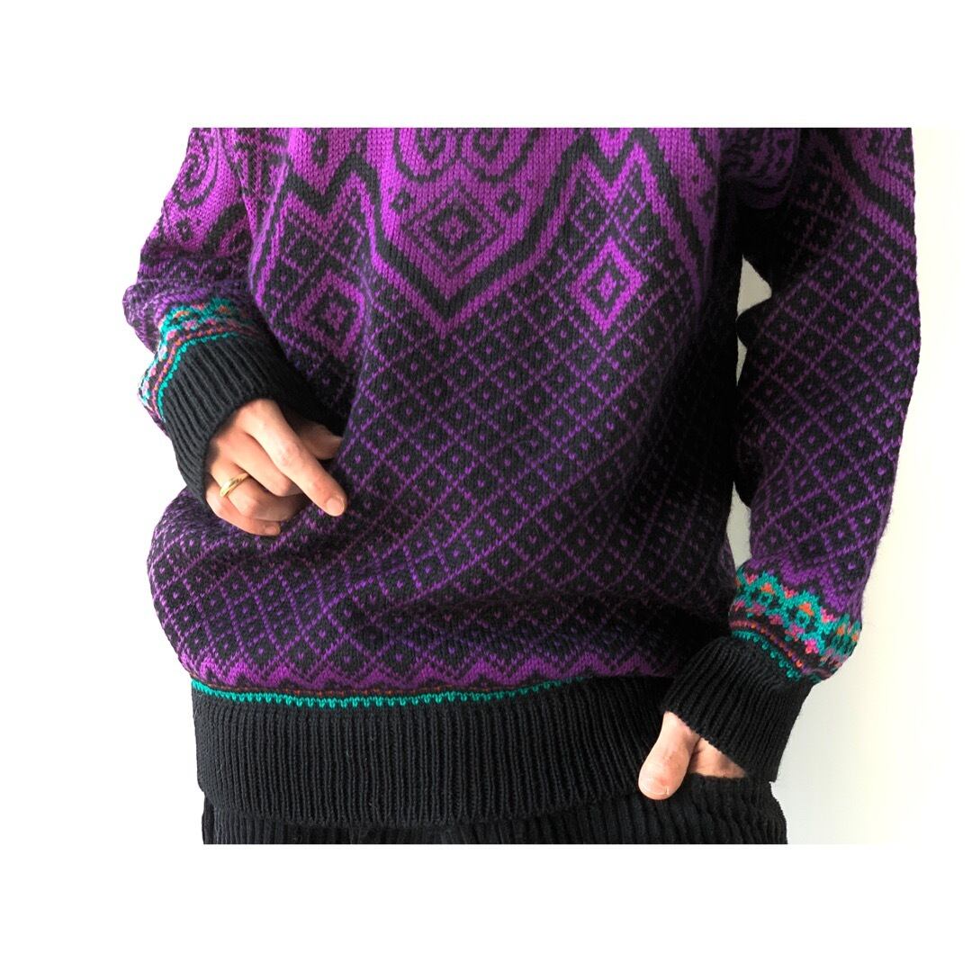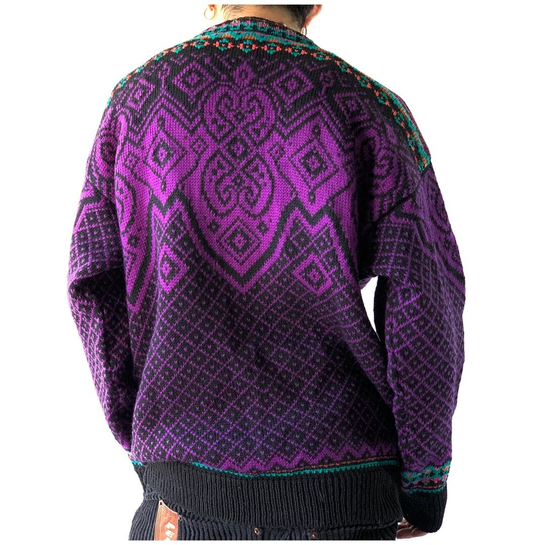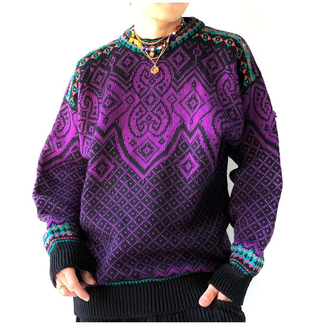 ノルディックな縁どり柄にオリエンタルな柄の融合が個性的なニット❗️ダークな紫とポップな色使いのコントラストが非常にきゃわええ❗️