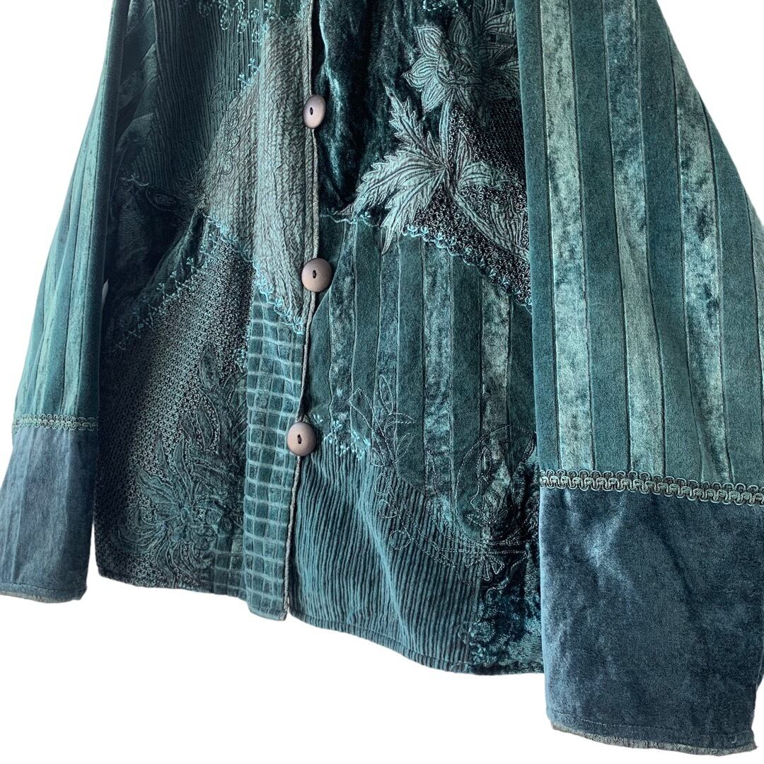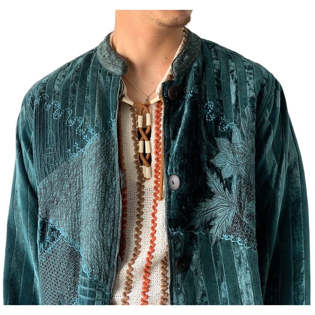 生地のMIX加減が絶妙なパネルデザイン、アクセントになった刺繍が高級感あるオリジナリティ溢れた古着特有の魅力が詰まったデザインが超クールな1着✨