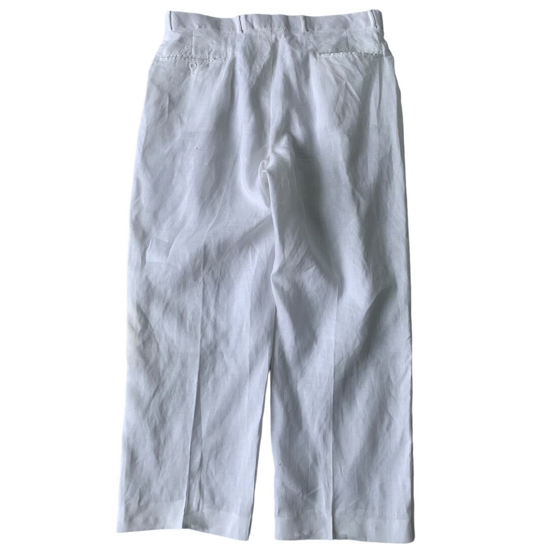・リネン特有の素材感あり、左膝辺りにシミがございます。