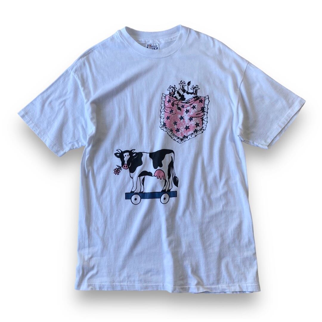 ♾90's design tee♾ cow motif pocket printed design tee sizeL/G MADE IN U.S.A.