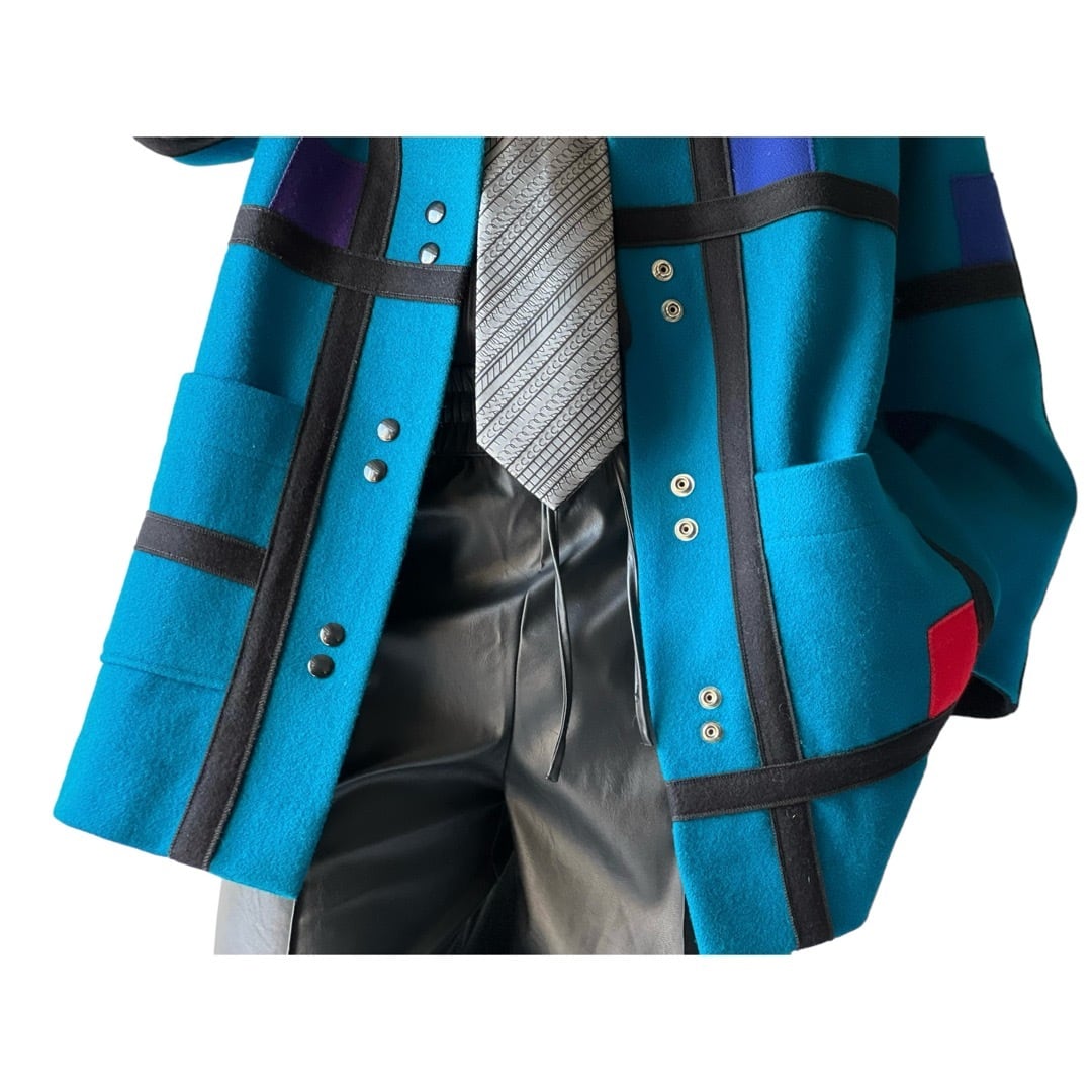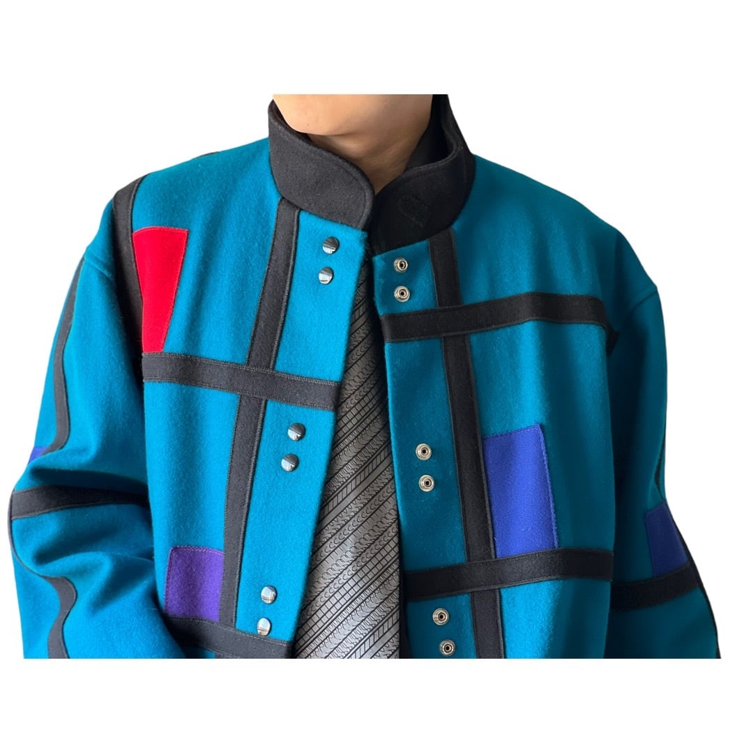 ブルーのボディにモンドリアンパターンの切り替えを施した稀有かつスペシャルなミドルレングスのウールコート。