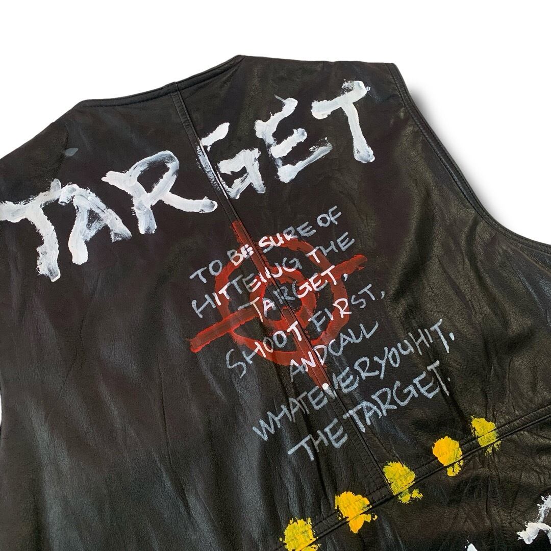 インパクト抜群"TARGET","HIGH VOLTAGE"の文字に加えセンターにはターゲットマーク、メッセージのハンドペイントデザインが目を惹くレザーベスト!!!