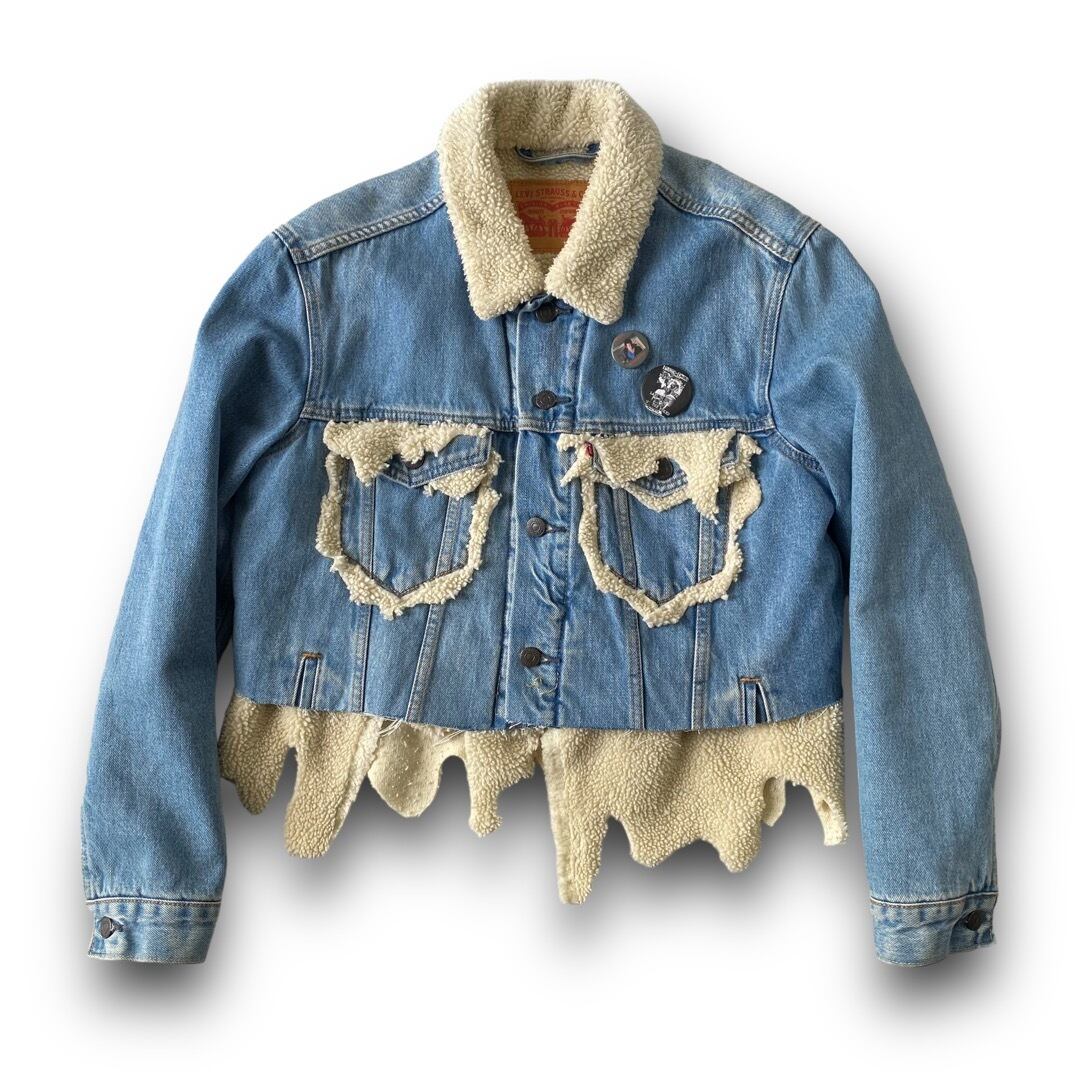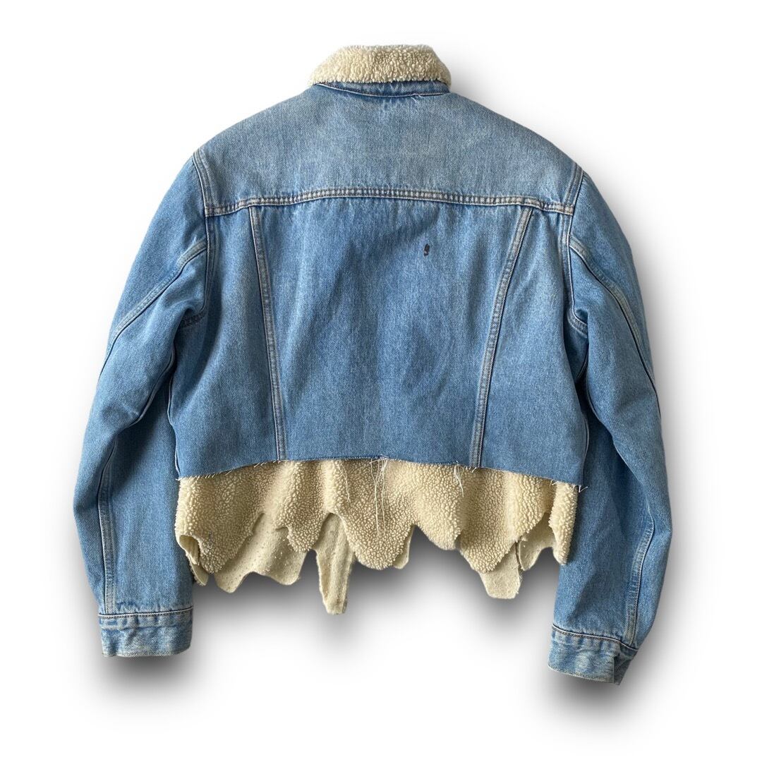Levi'sの裏ボアデニムジャケットをカットオフでショート丈にし裏のボアが垂れるように裾から伸びるリメイク✨