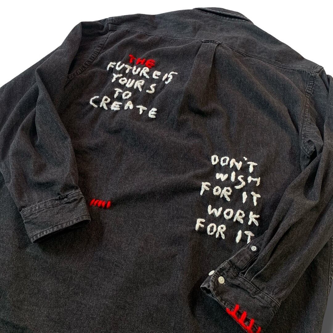 背面にハンドステッチでメッセージロゴを施したカスタムデザインがキュートなデニムシャツ!!!