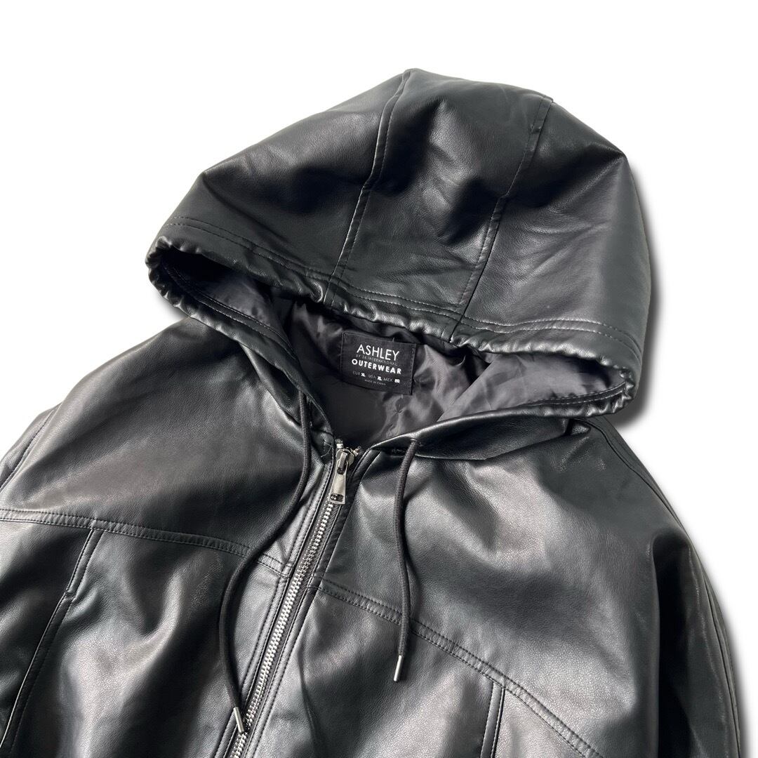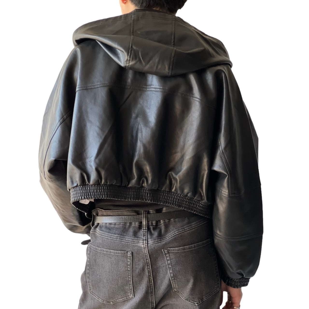 【ASHLEY OUTERWEAR】 Faux leather hooded short jacket