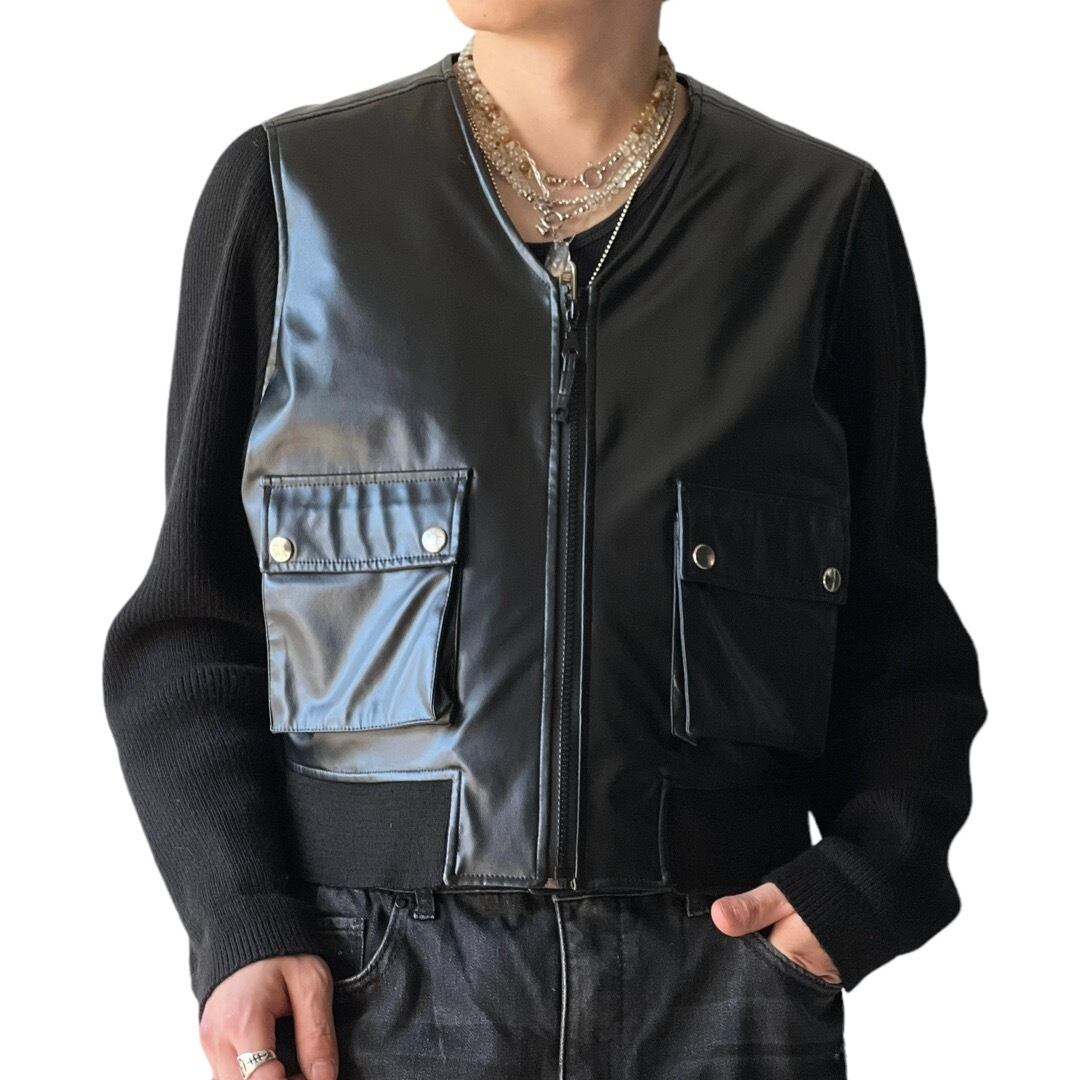 フェイクレザーとニットのドッキングジャケット。