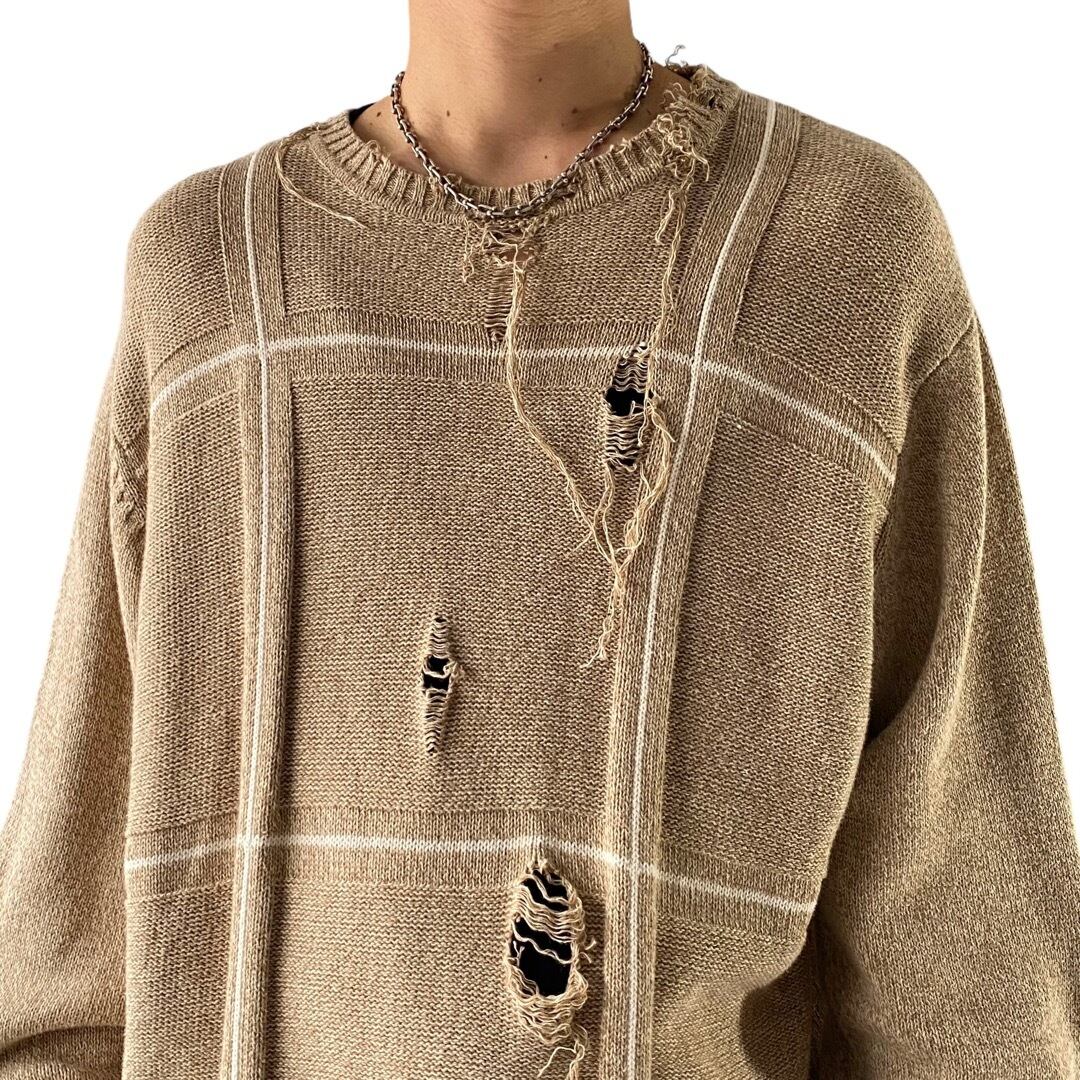 人気の高いシンプルボディのパネルに大胆なダメージ具合がポイントのデザインニット