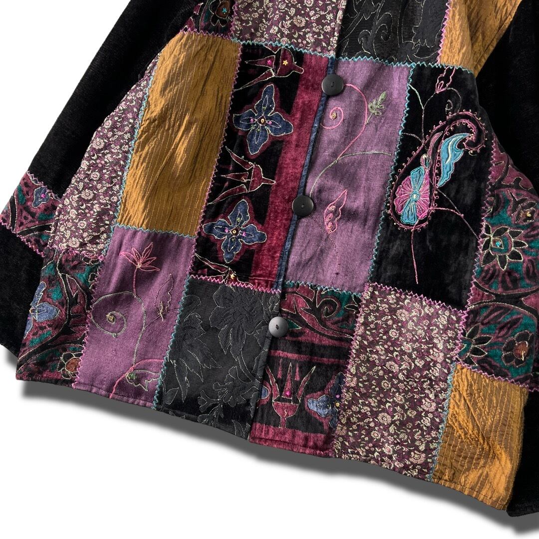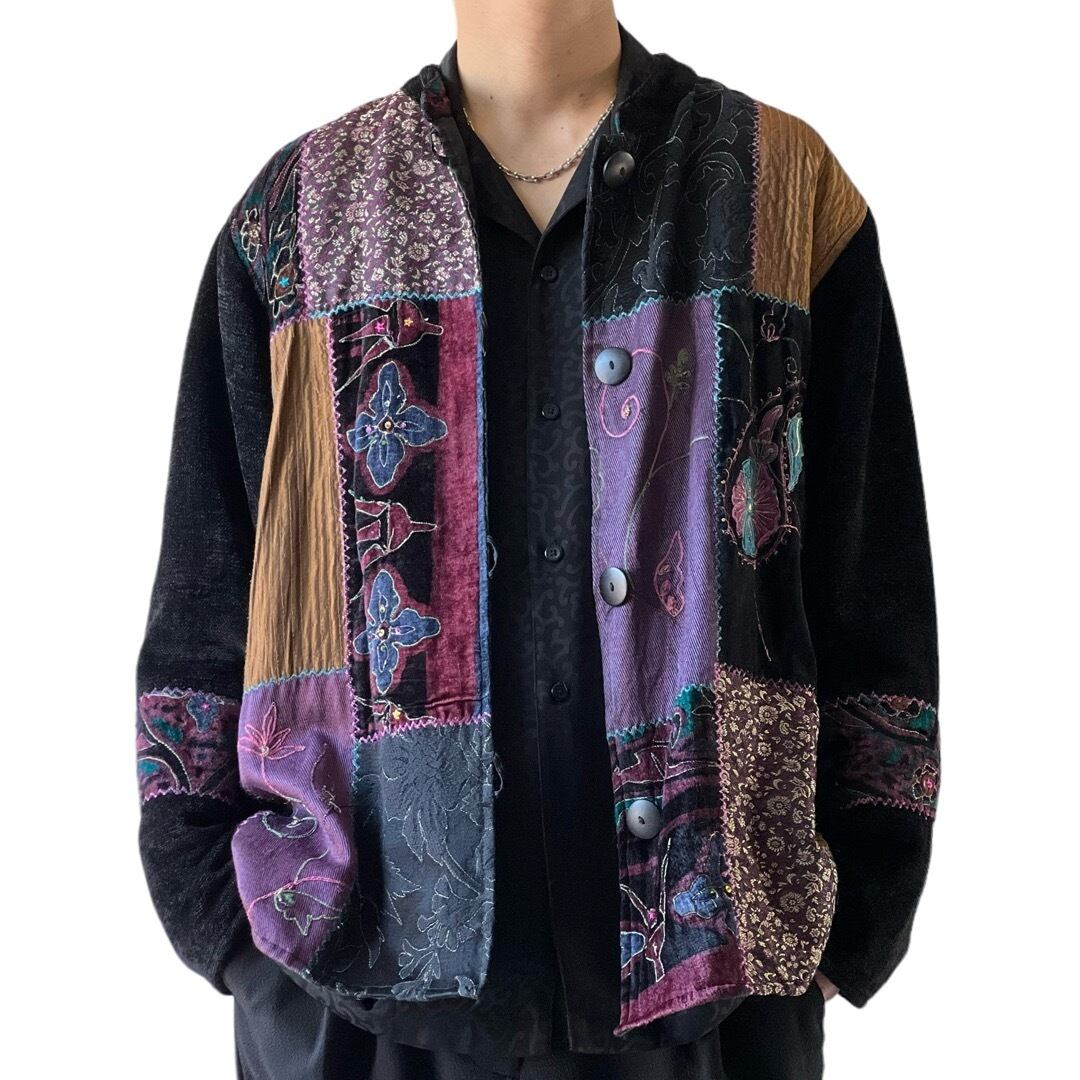 【flashback】 Patchwork velvet swinging design collarless jacket