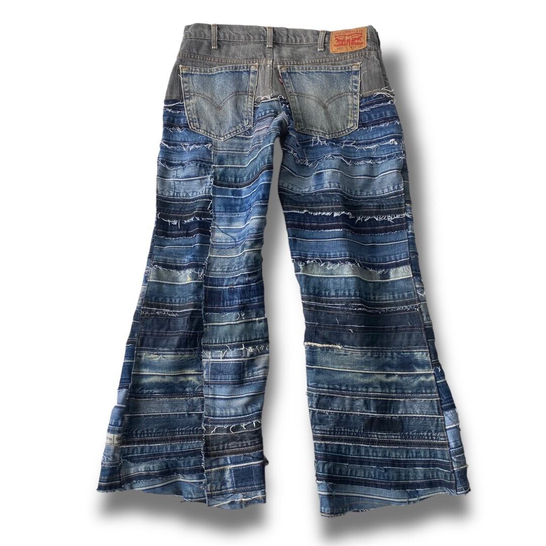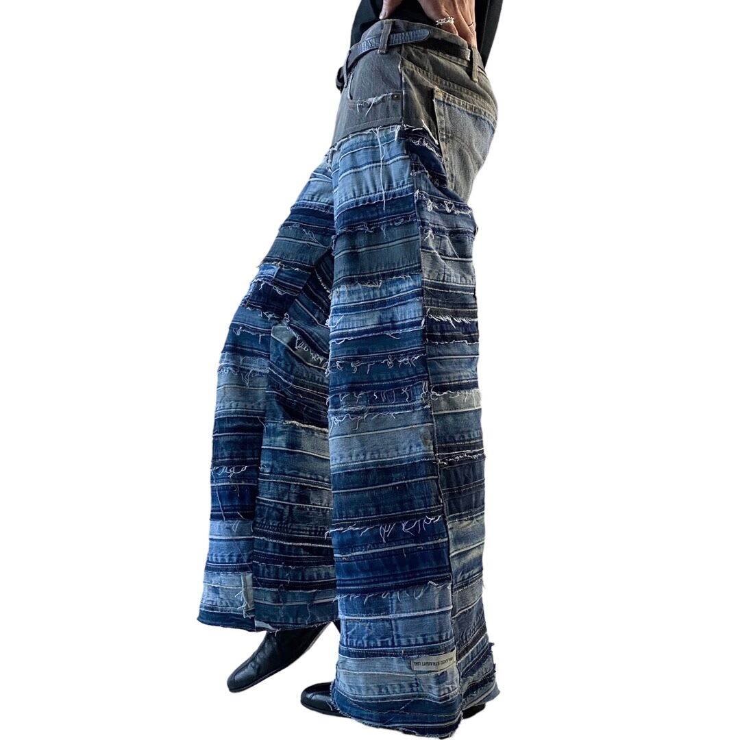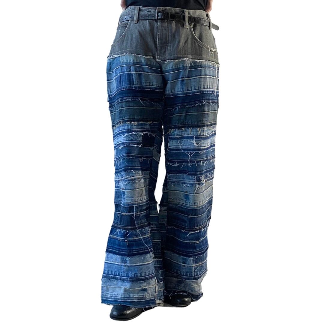 突っ切った存在感が圧倒的なリメイクカスタムを施した地層デザインワイドフレアデニムパンツ。