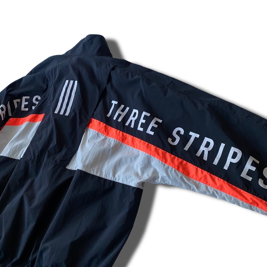 背中から袖にかけてTHREE STRIPESの文字が疾るデザイン✨