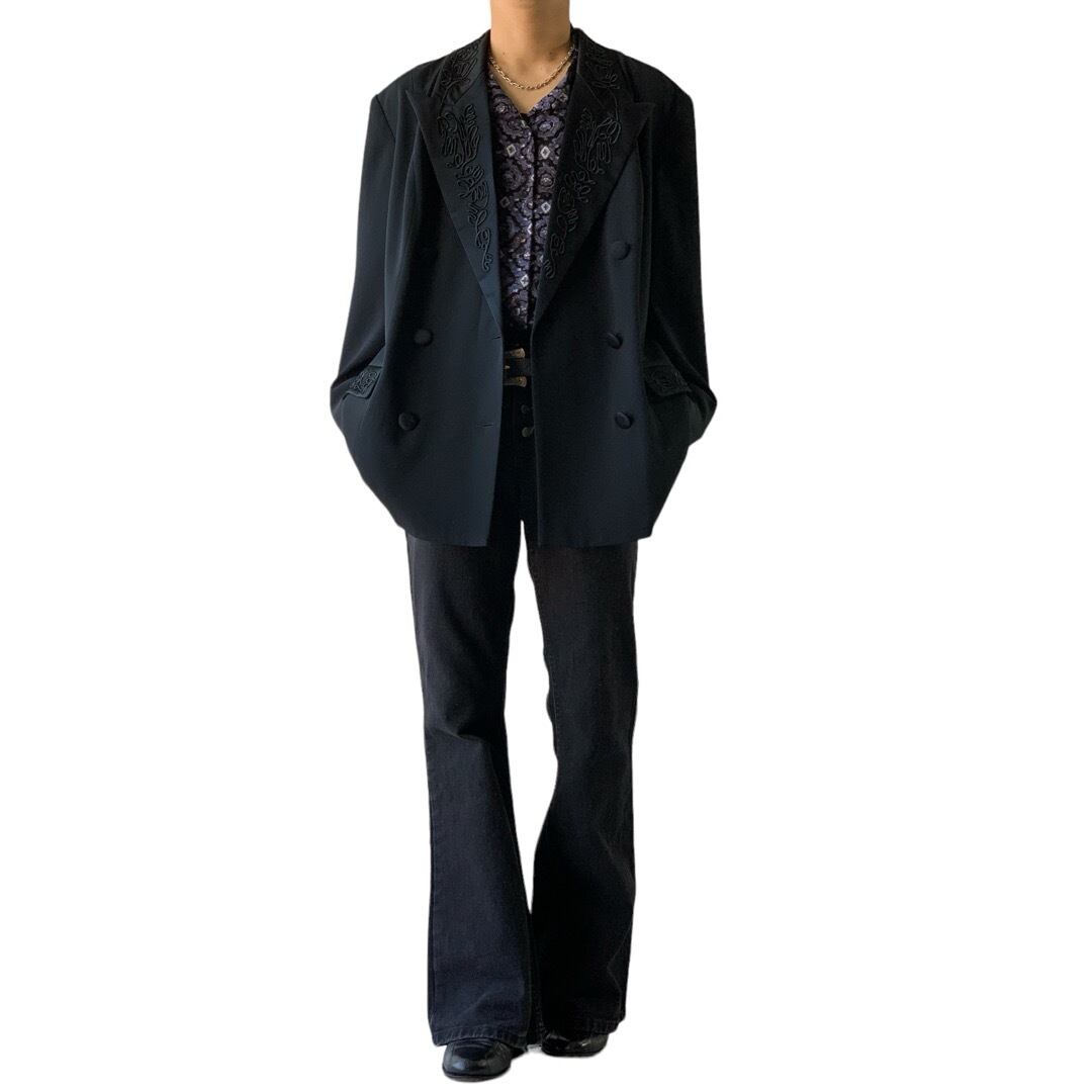 左右対称のバランスの良い刺繍、袖や襟のサテン地切替が特徴的なデザインジャケット。