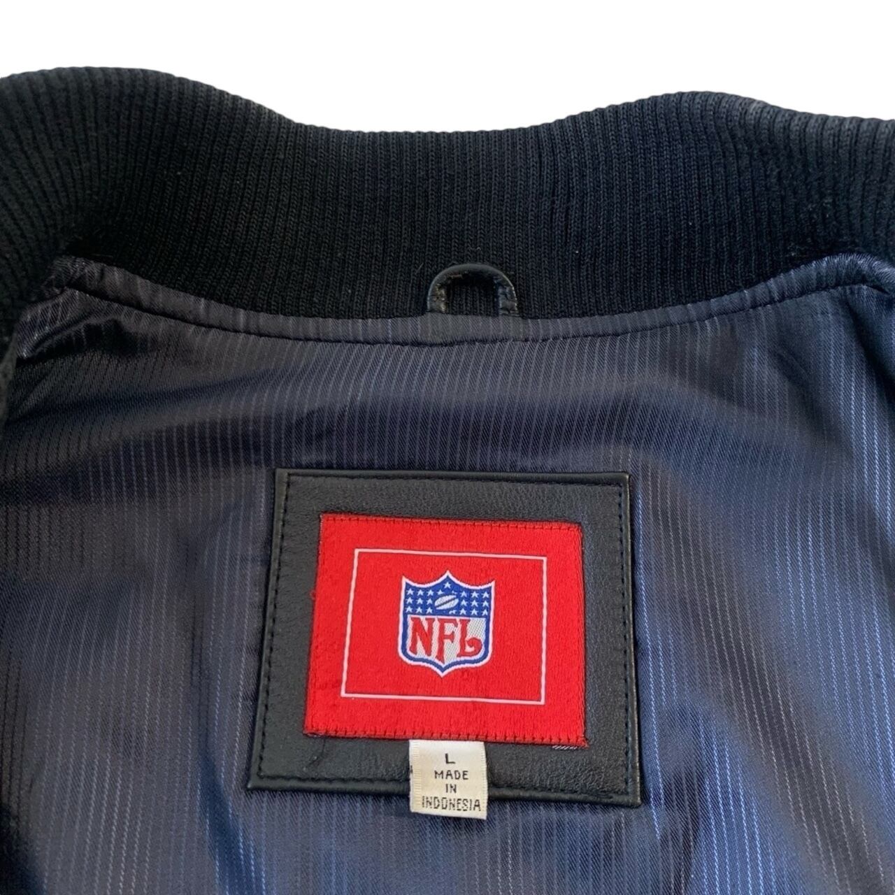 チームカラーを載せたレザーの切替に美しく施されたロゴ刺繍と袖のNFL刺繍✨