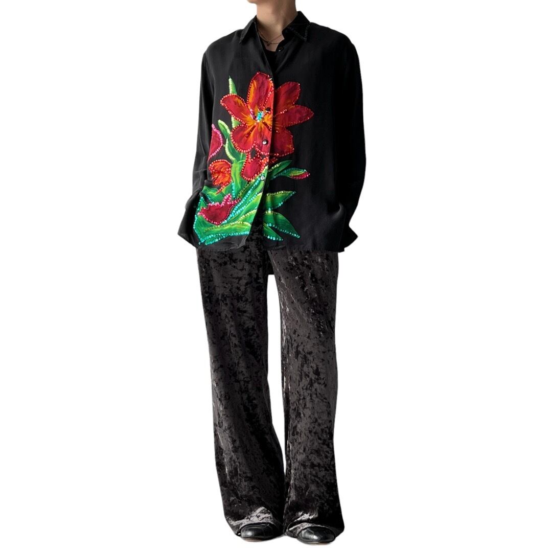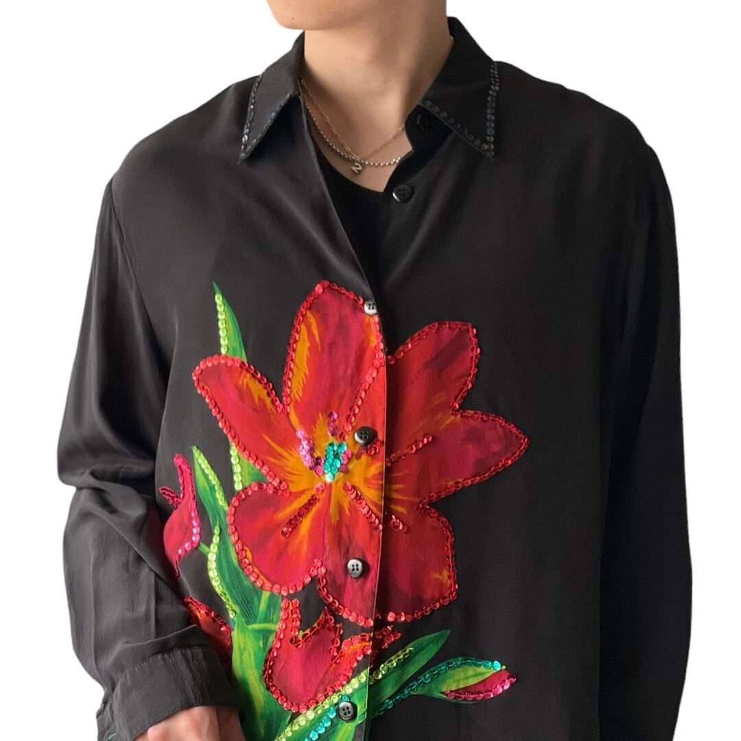 Flower print Sequin Design Silk shirt