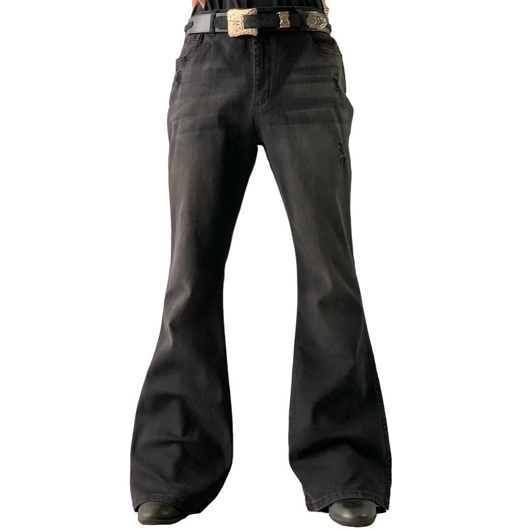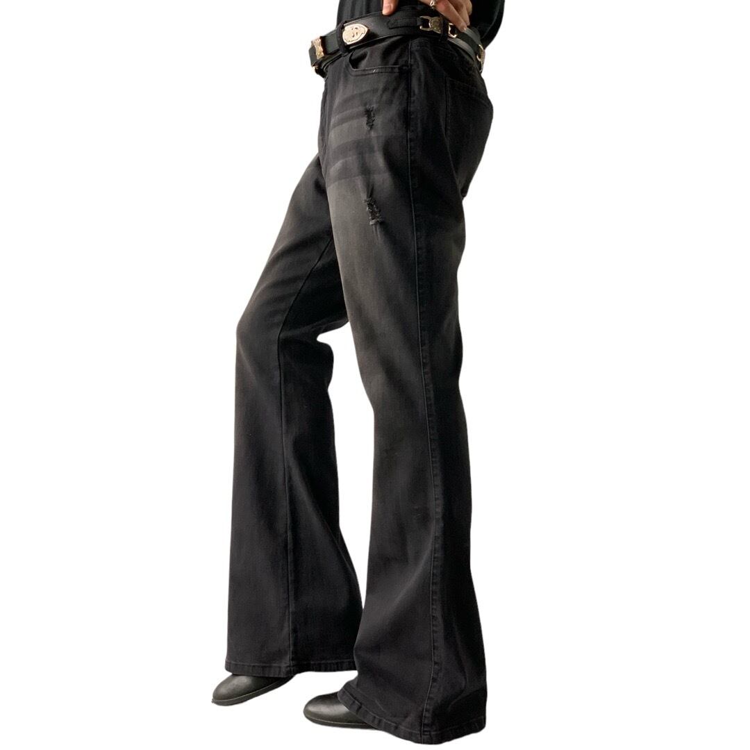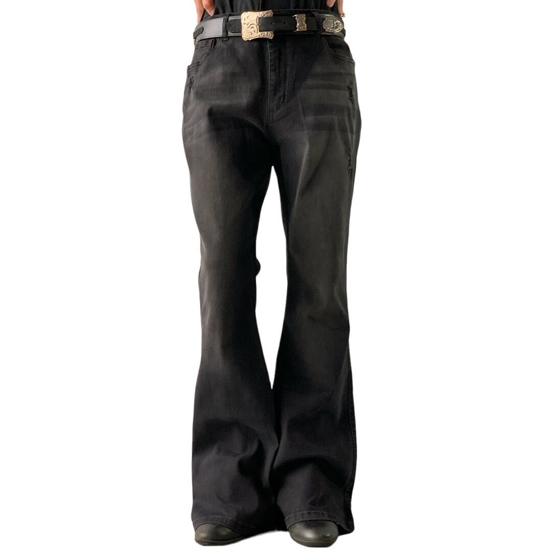 部分的ダメージ加工がアクセントになったメガフレアシルエットが最高なブラックデニムパンツ!!!