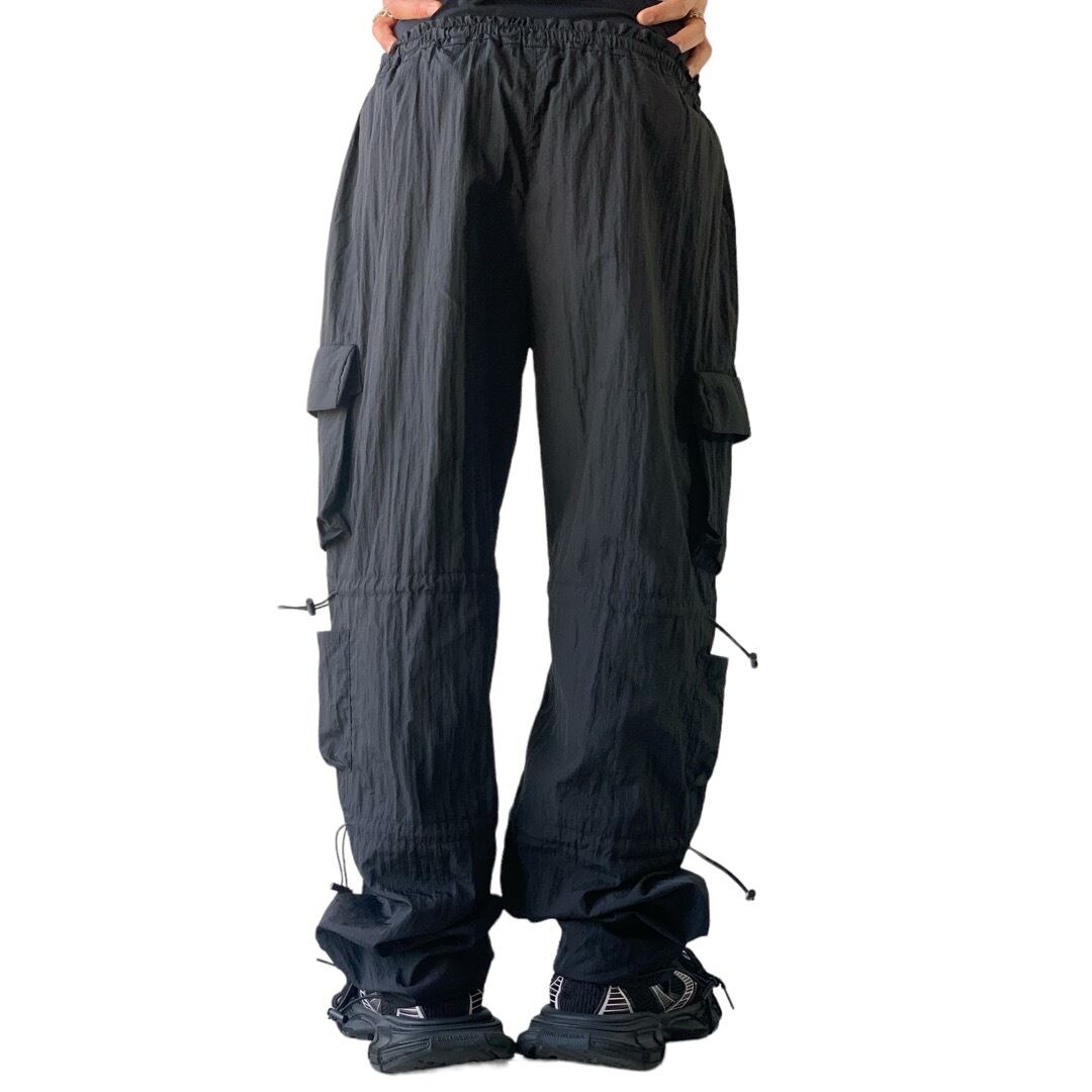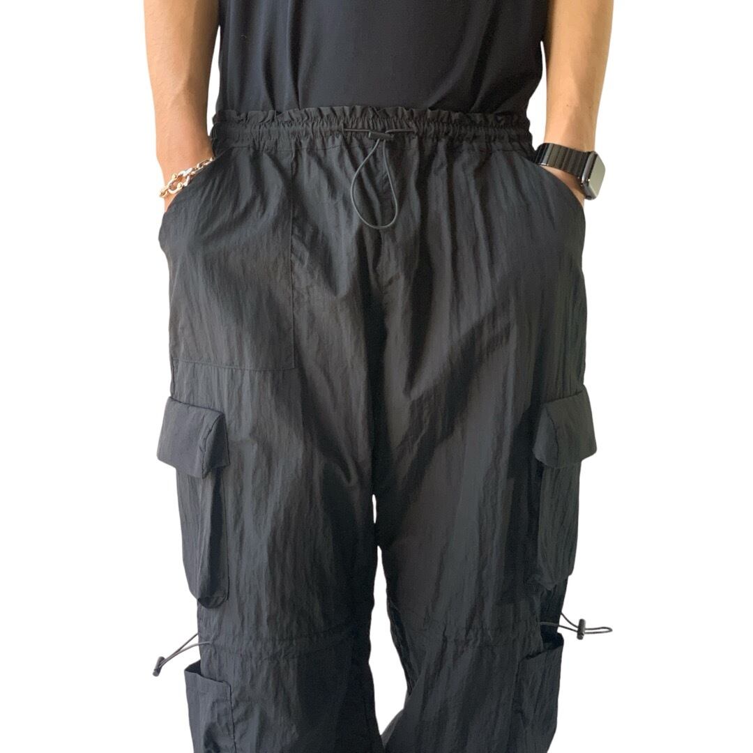 汎用性抜群、オールブラックでWポケットのカーゴディテールにドローコードデザインが特徴的なナイロンオシャレテックパンツ!!