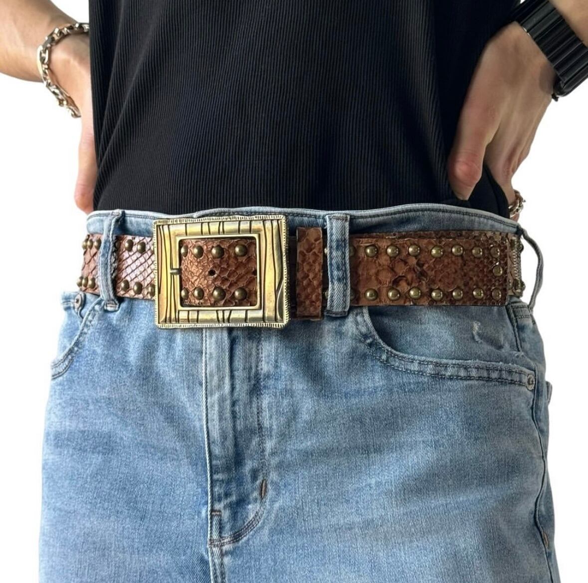 リアルパイソンレザーにスタッズを打ち付けた存在感抜群なおベルト。