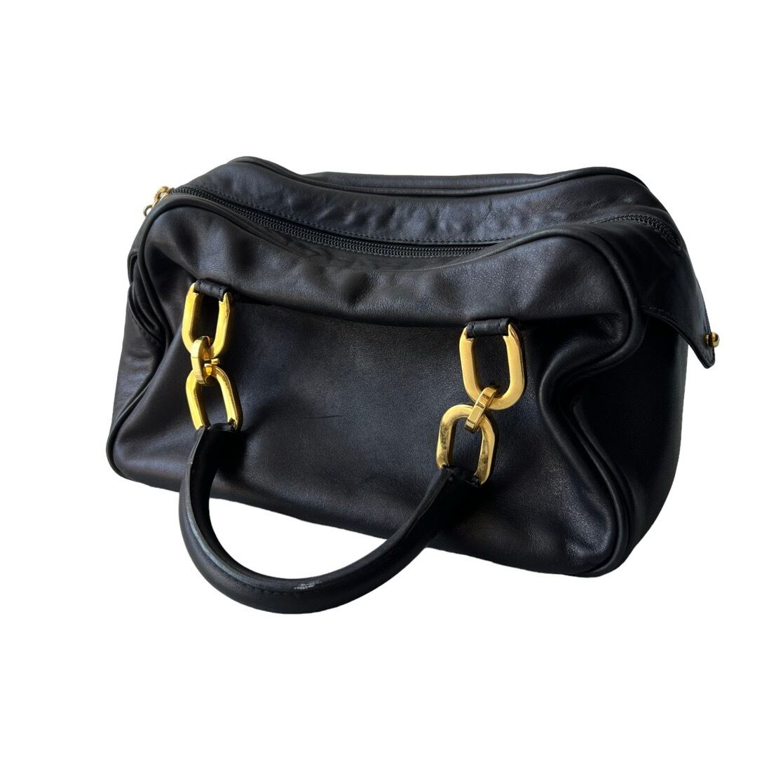 ゴールドのチャームが目を惹くブラックレザーのハンドバッグ。