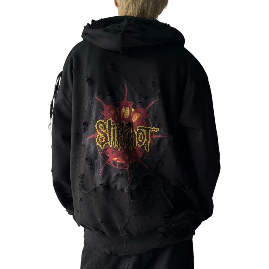 雰囲気抜群でスリップノットのデザインパッチを両面に施しダメージを加えたデザインフーディ‼︎‼︎