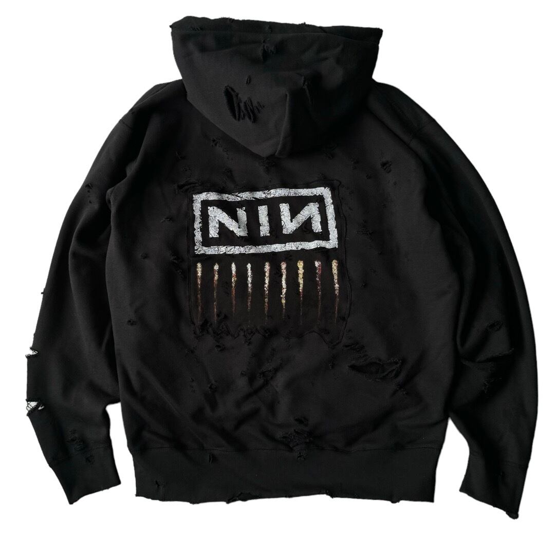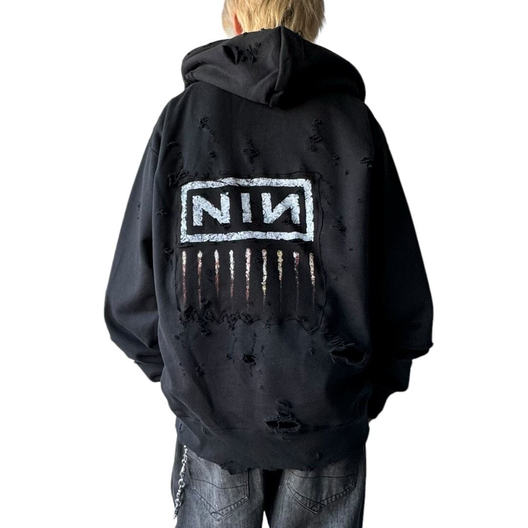 nine inchのTシャツ中でもかなり人気なこのデザインを前後にパッチしダメージを加えたデザインフーディ‼︎‼︎