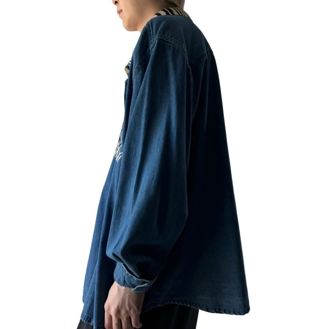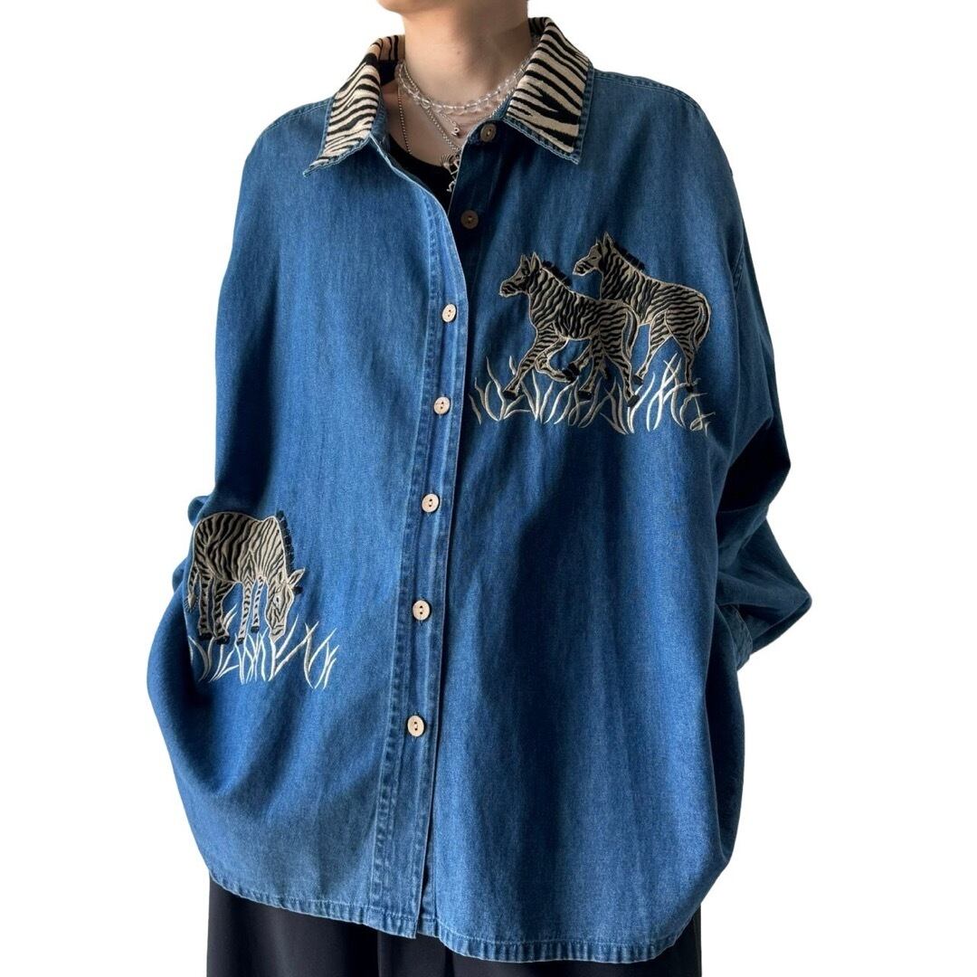 襟、袖、バックプリーツとラグのような生地でゼブラ柄切り替えが可愛らしいデニムシャツ‼️