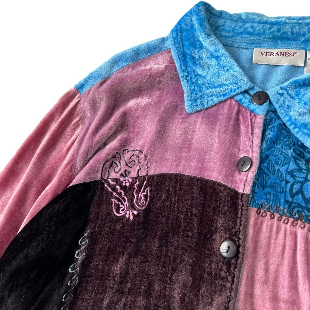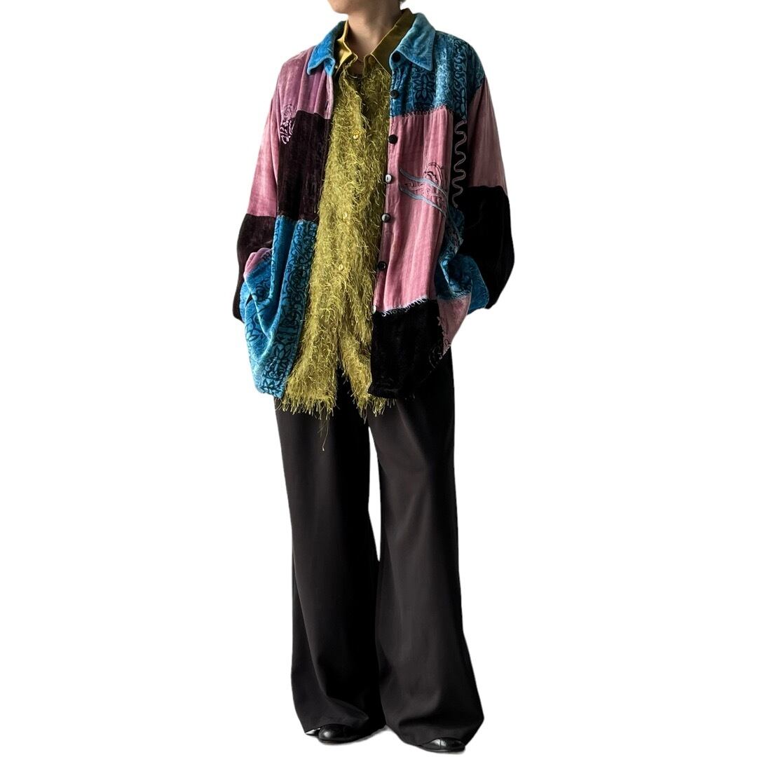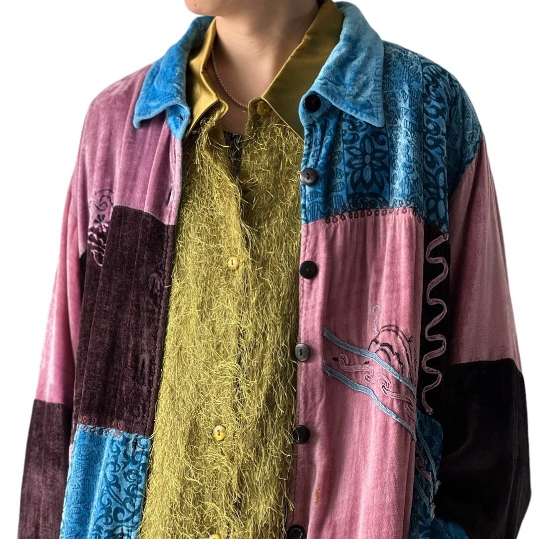 ベロアシャツに色違い、柄違いのパッチワークが施された神デザイン✨