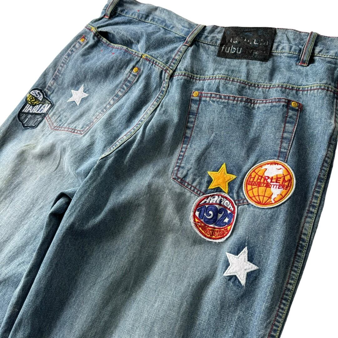 ♾platinum fubu♾ patch work design wide buggy denim pants
