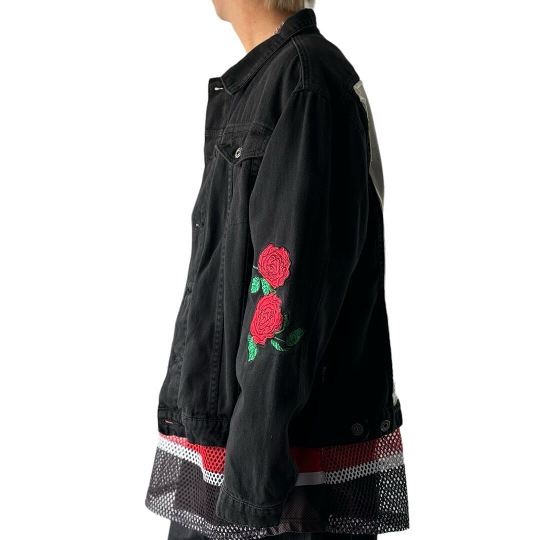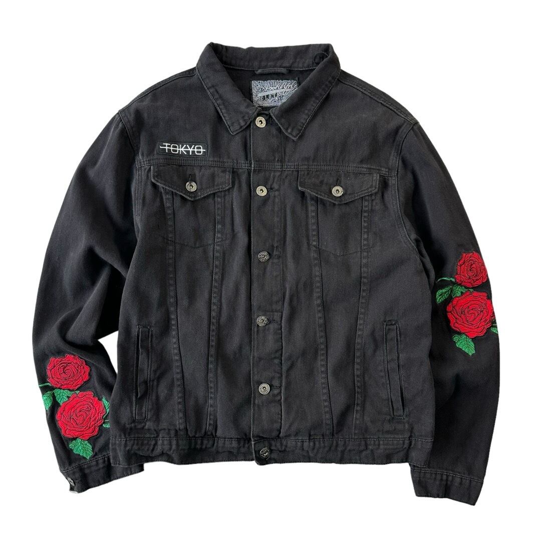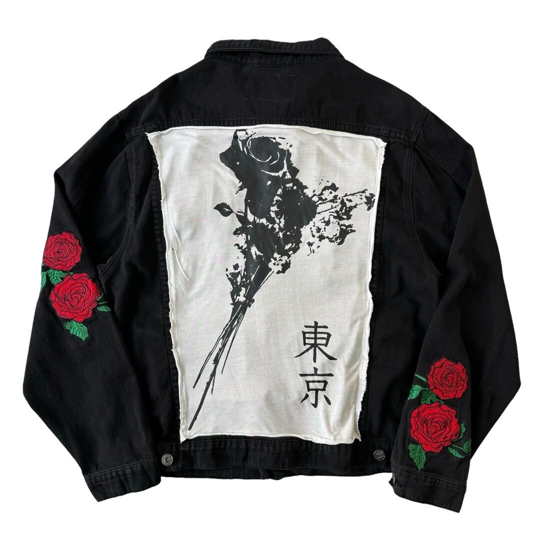 両袖には薔薇の刺繍を施し、胸にTOKYOのパッチ、そして背中にはモノトーンで和風なタッチで描かれた薔薇と共に東京の文字.