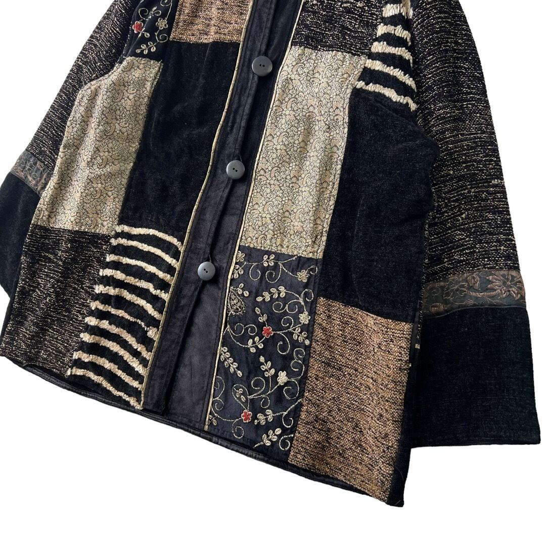 【flashback】 Patchwork velvet swinging design collarless jacket