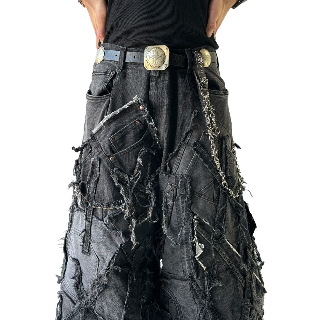 数本のデニムを足して作られているので通常ではあり得ない袴のように広がるメガワイドシルエット❗️