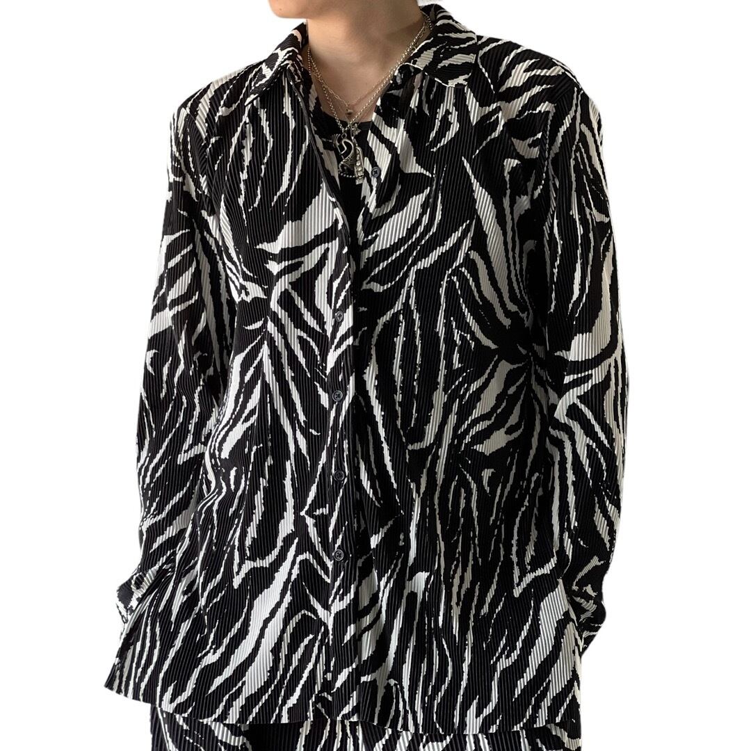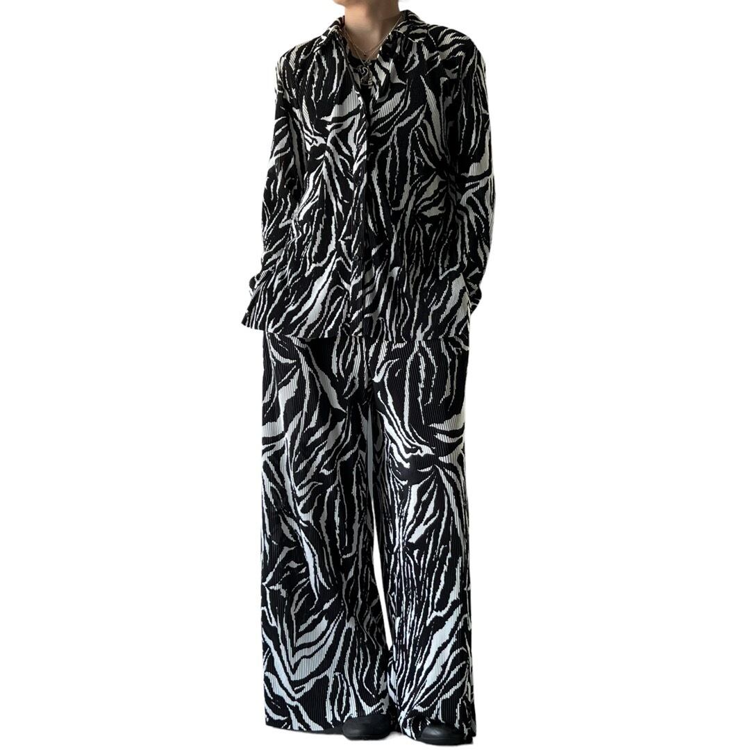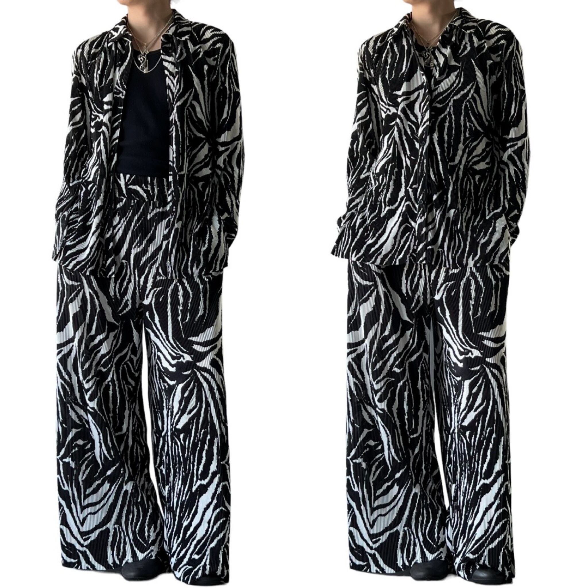 ゼブラ柄のようなアートなデザインが目を引くプリーツのお洒落セットアップ‼️
