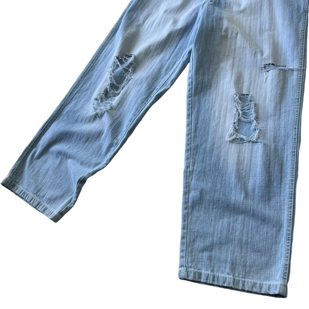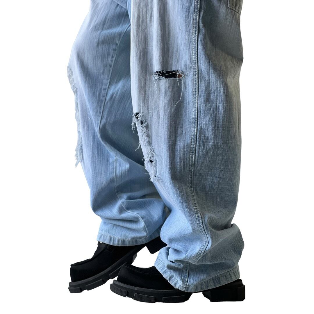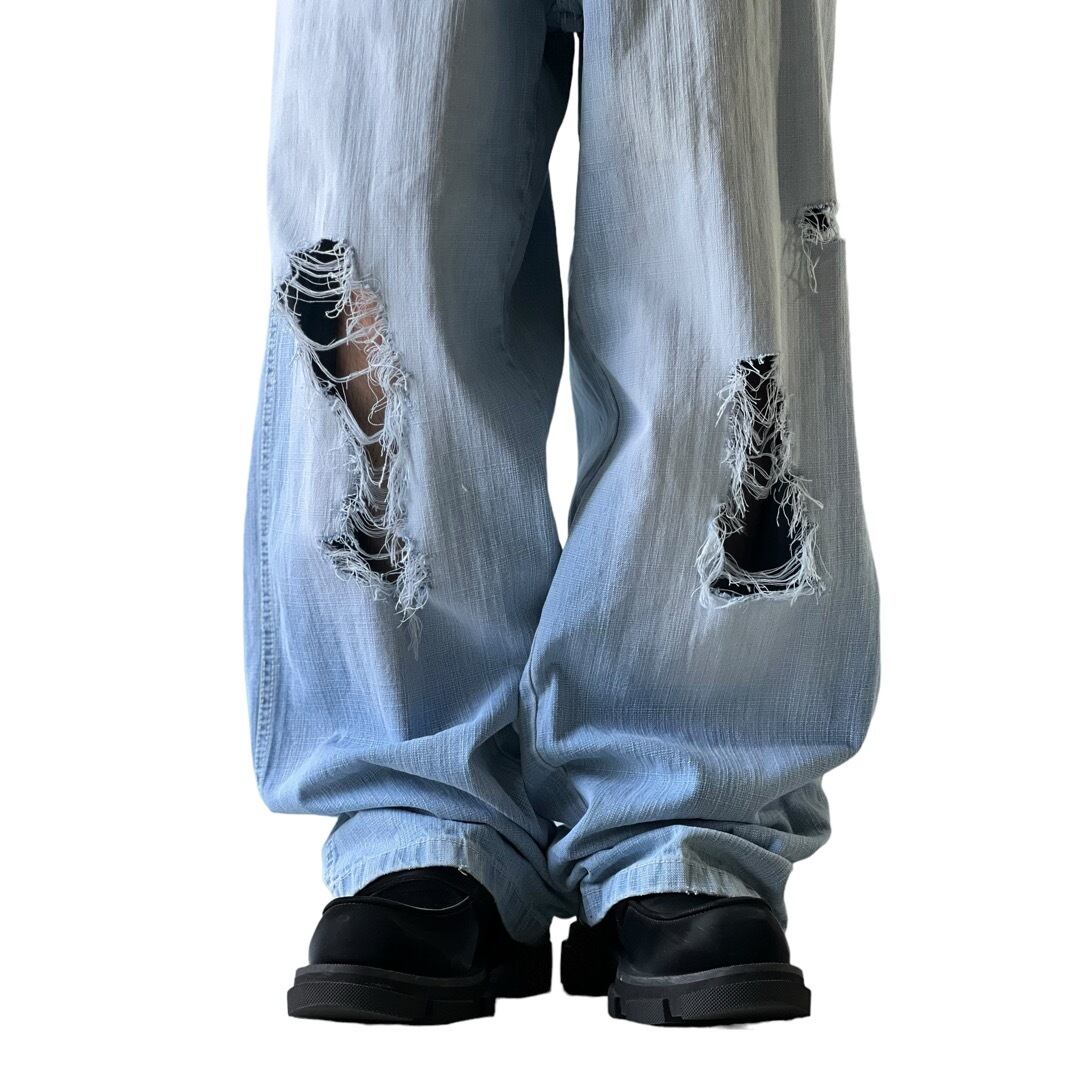 淡いスカスカに色落ちたブルーデニムにブランド独自のセンスあるダメージ加工が雰囲気抜群で春夏とっても気分❗️