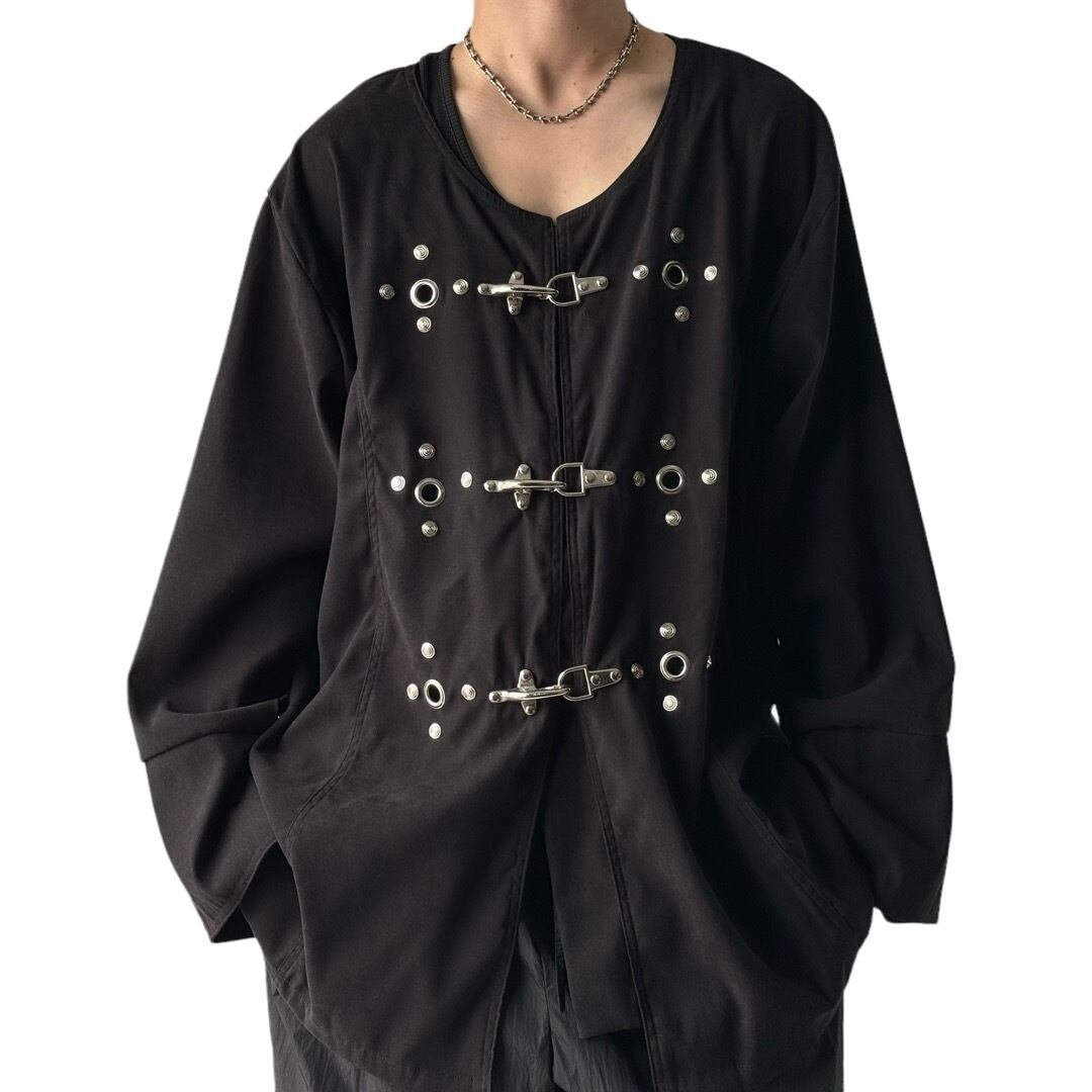 スムース地のブラックボディのフロントにファイヤーマンジャケット特有のバックル、そのサイドにアイレットとスタッズをデザインしたジャケット‼︎‼︎