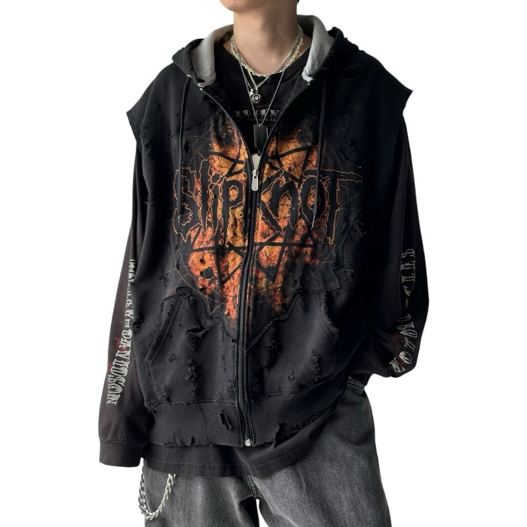" SlipKnoT " design crushed sleeve less zip up hoodie