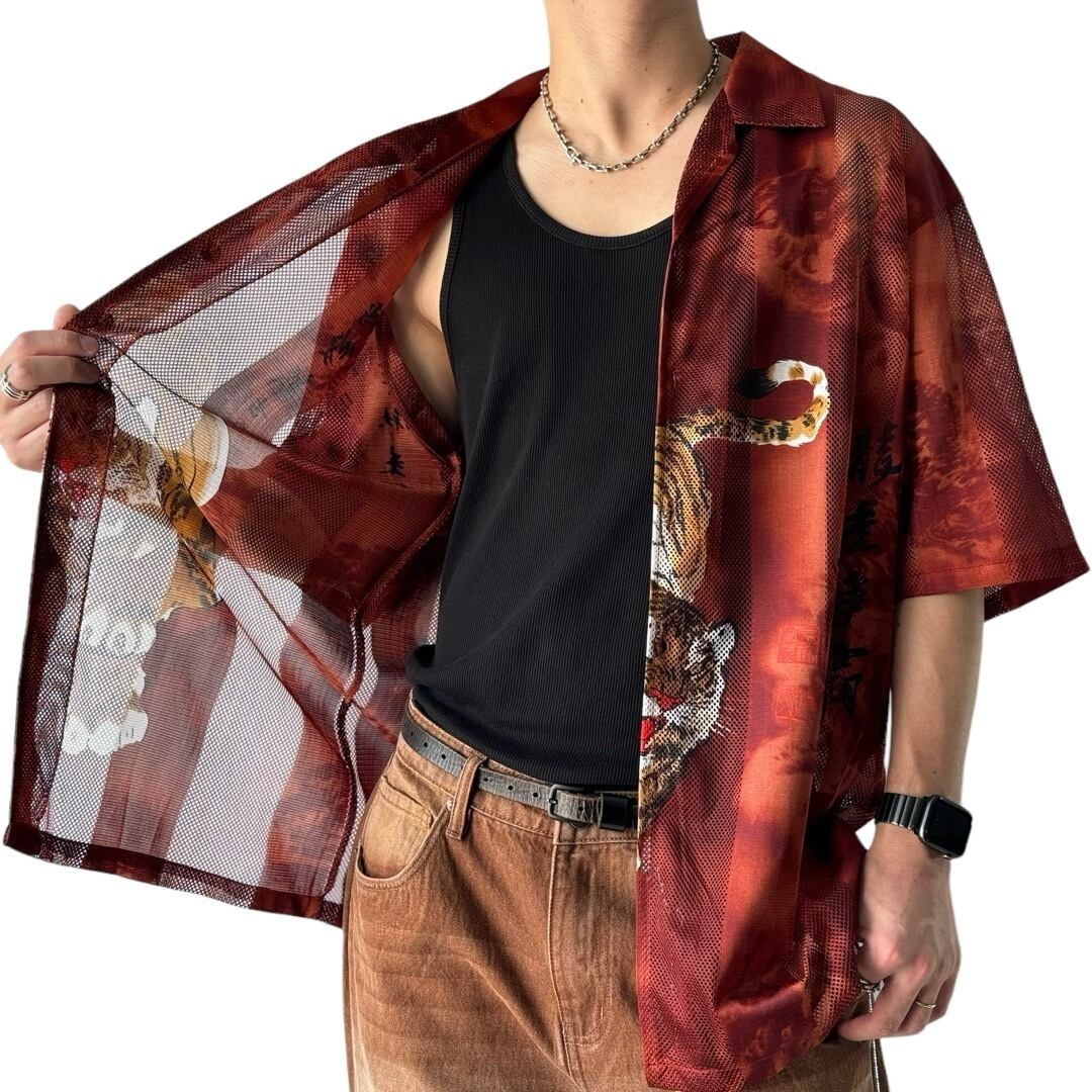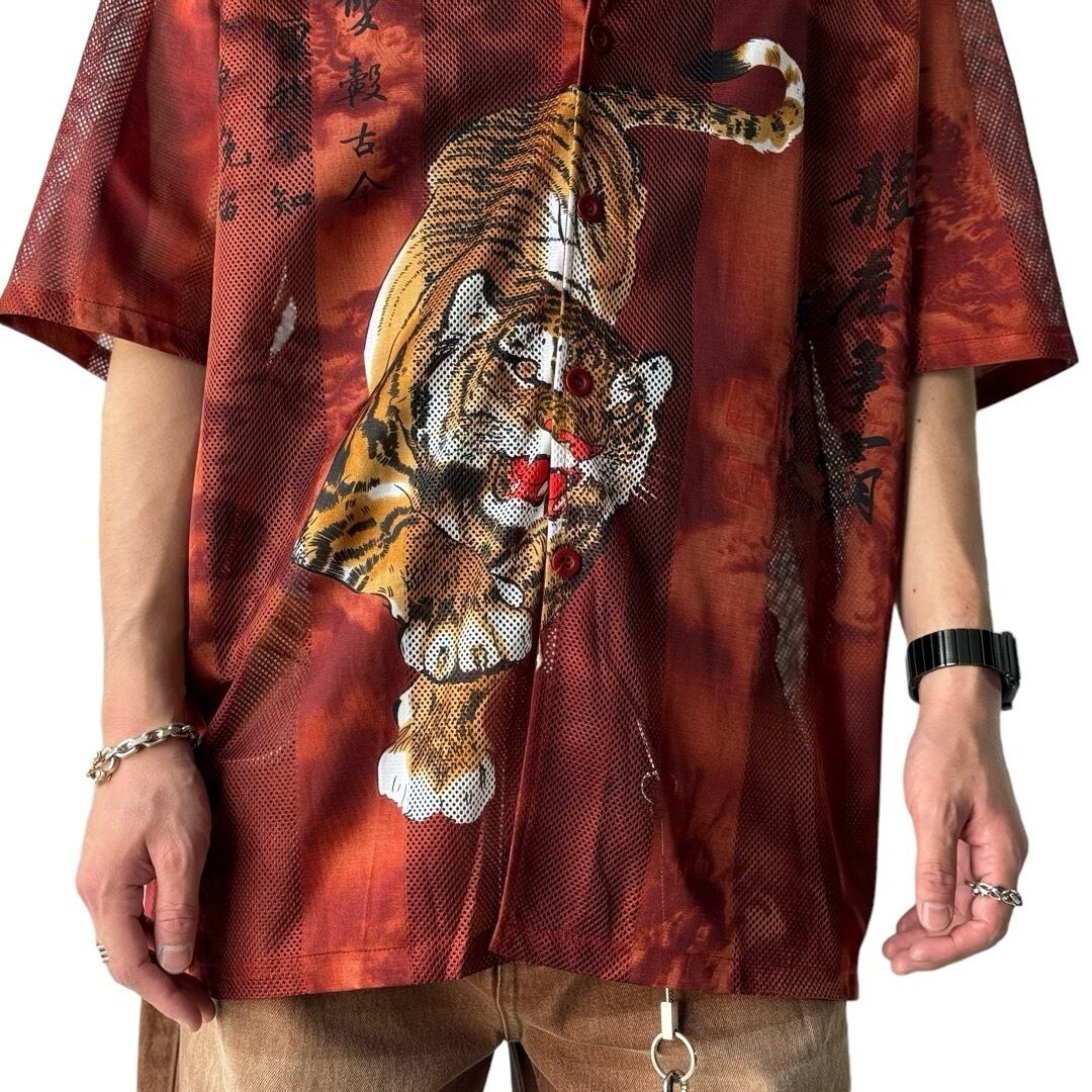 tiger pattern s/s stripes mesh shirt