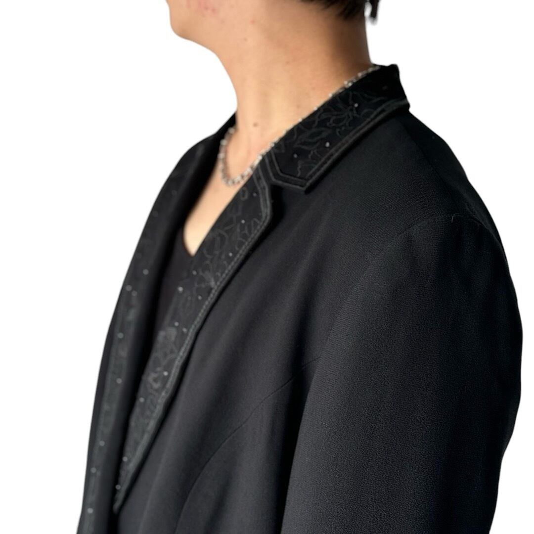 ラペル部分にフラワーモチーフの豪華刺繍を施し縁取るようにスパンコール、部分的にアクセントにあしらったラインストーンが超バエるデザイン!