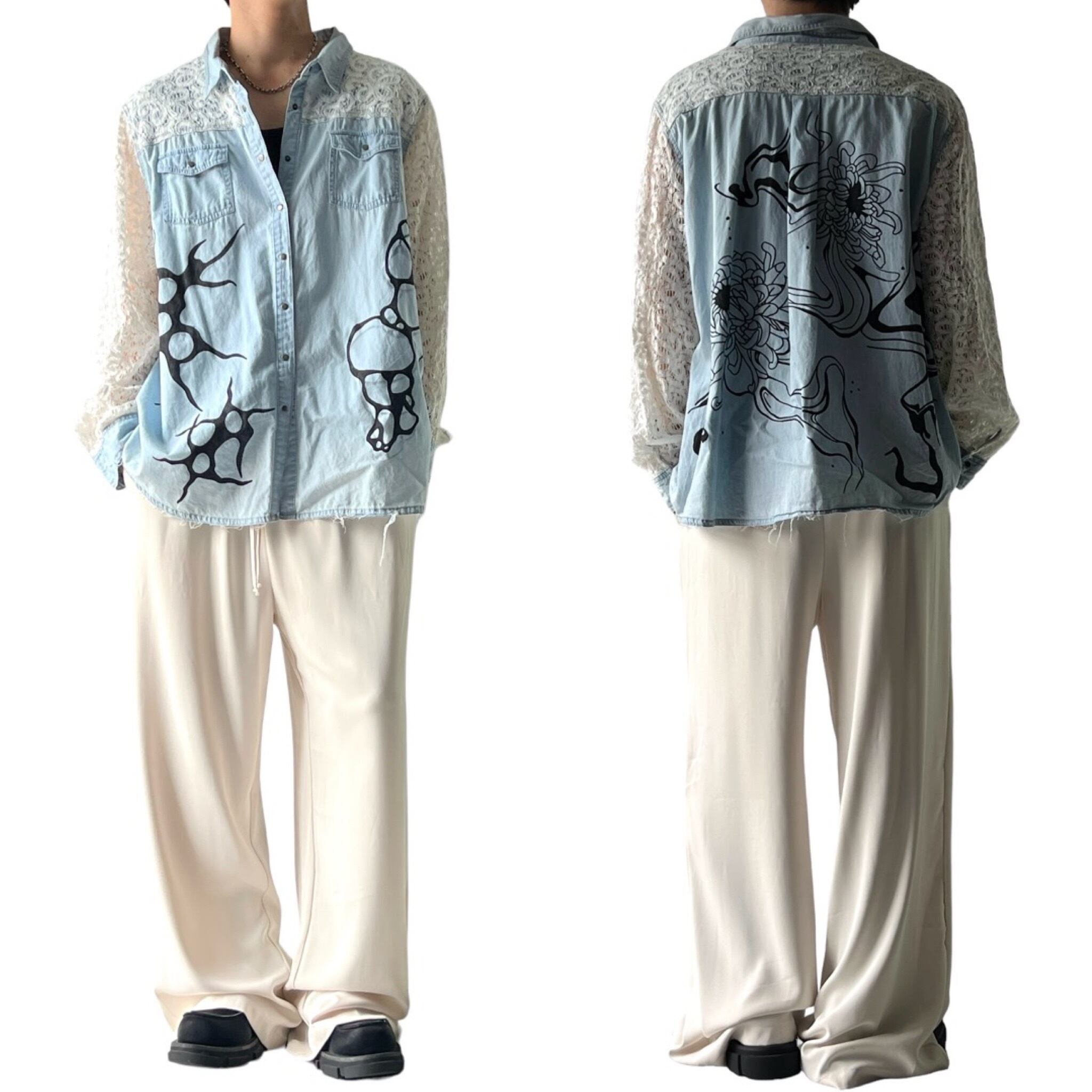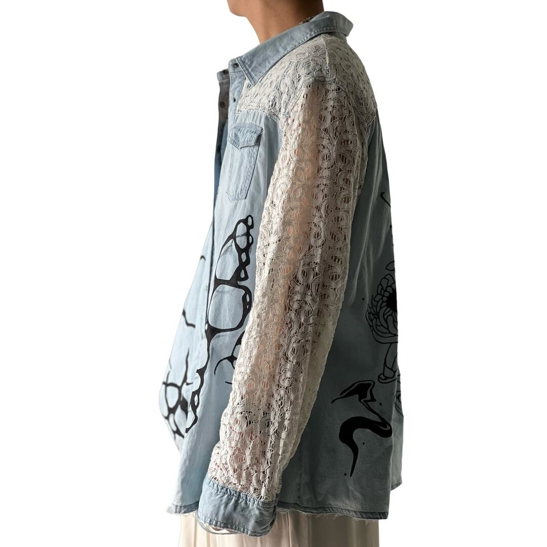 【CATO】 "Tribal Flower Paint Pattern" Lace swiching chambray shirt Jacket