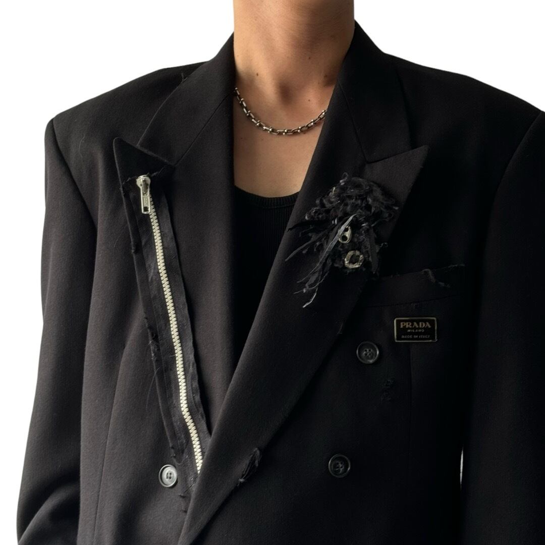 ラペルにはジップやモチーフ、ポケットにプレートを付けたよりオンリーなデザイン.