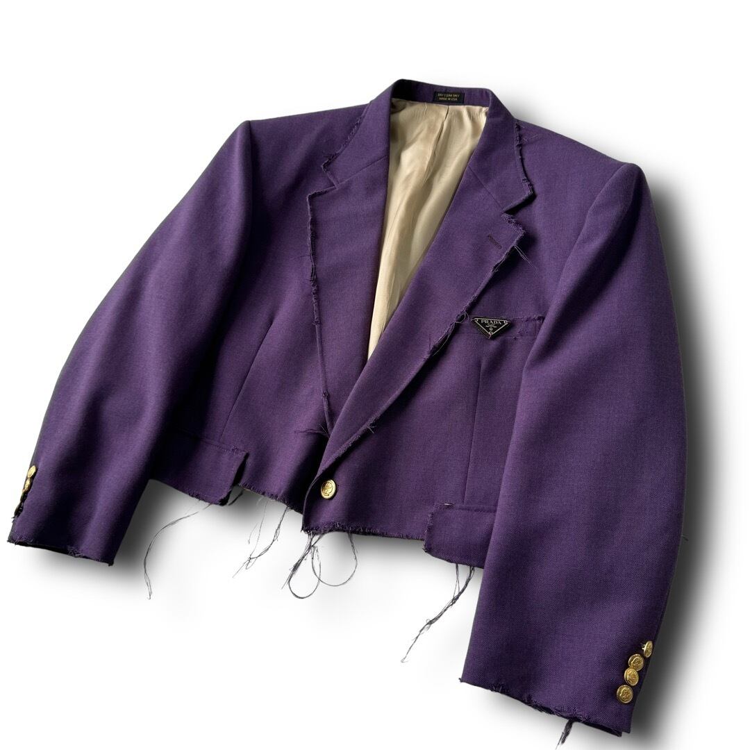 目を引く素敵なパープルカラーにアクセントになったゴールドトーンのボタン◎丈は大胆にカットされトレンドライクなシルエットに◎