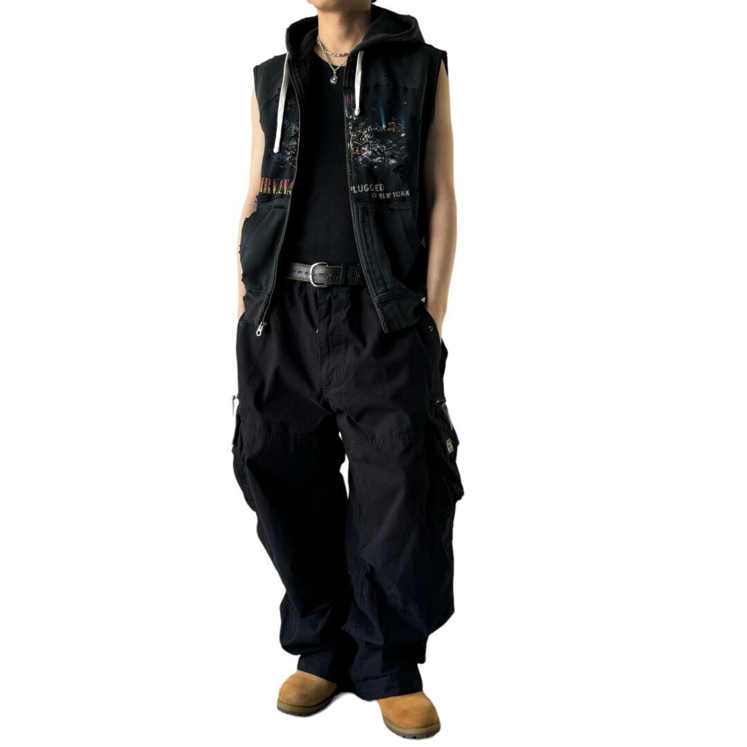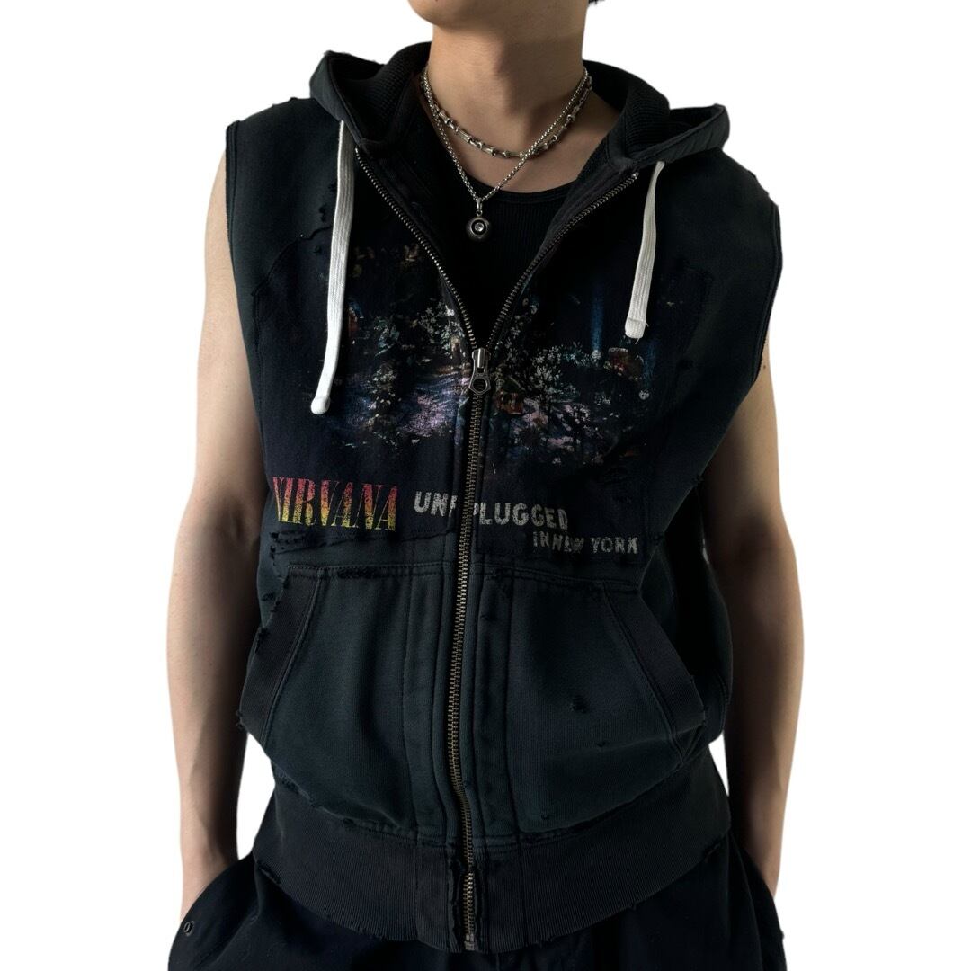 NIRVANAのインパクト抜群な両面カスタムにダメージ加工を施したスリーブレスジップフーディー‼️