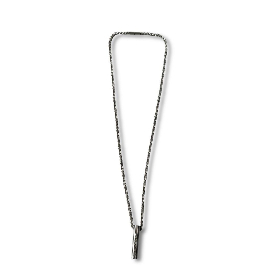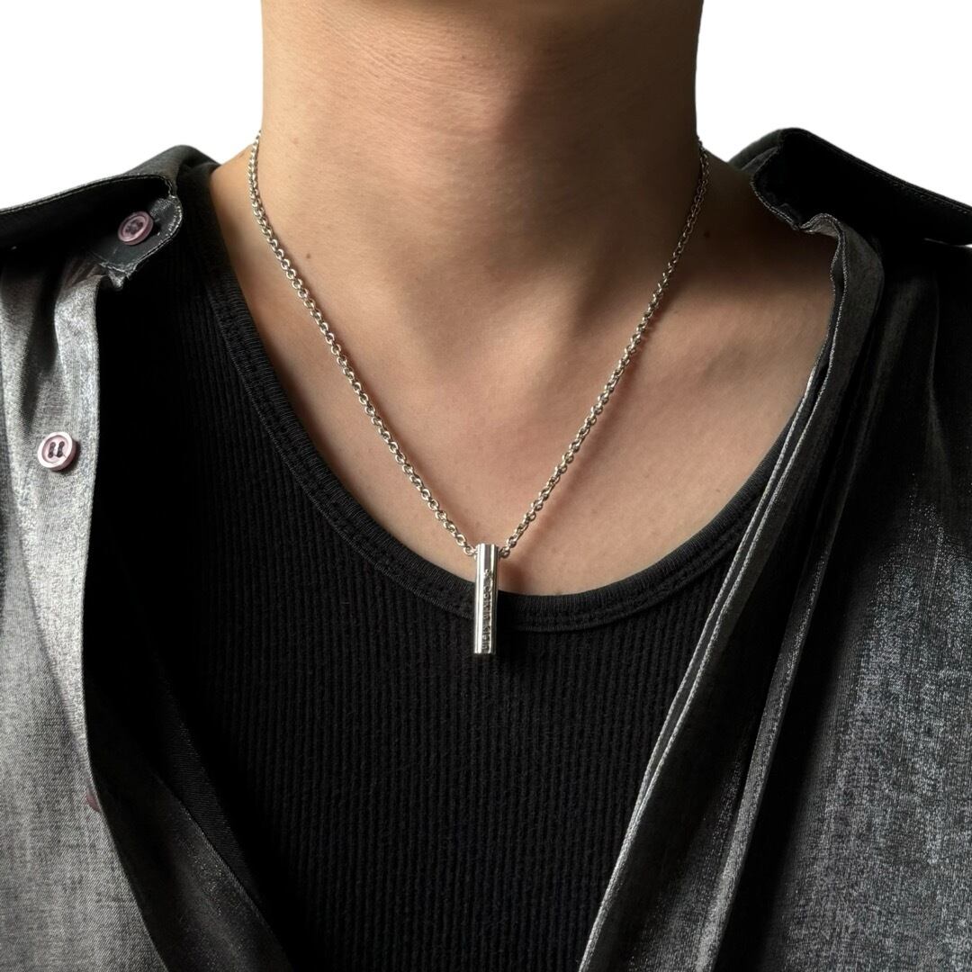 ブランドロゴの刻印を施した円柱状のチャームが着けやすいシルバーネックレス✨