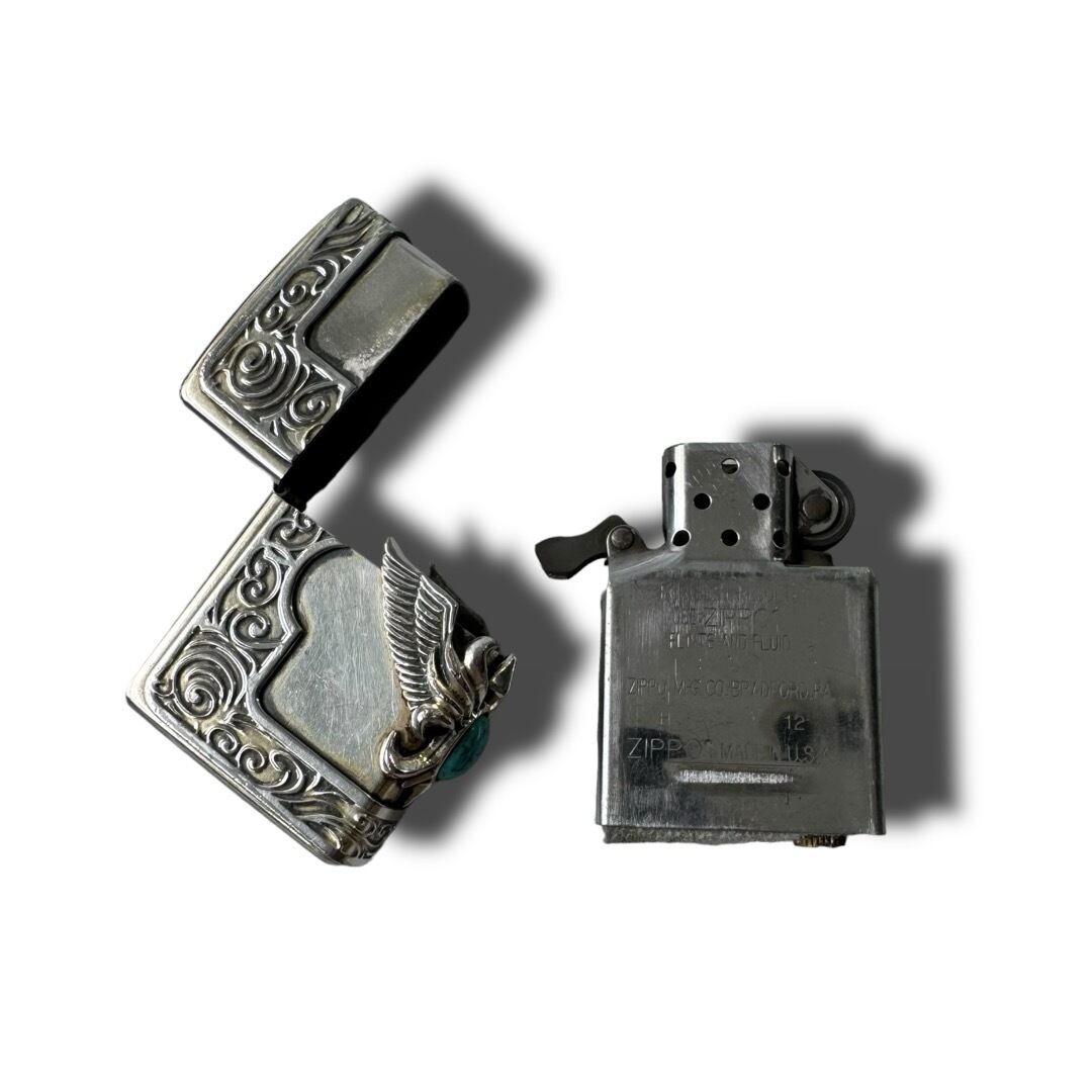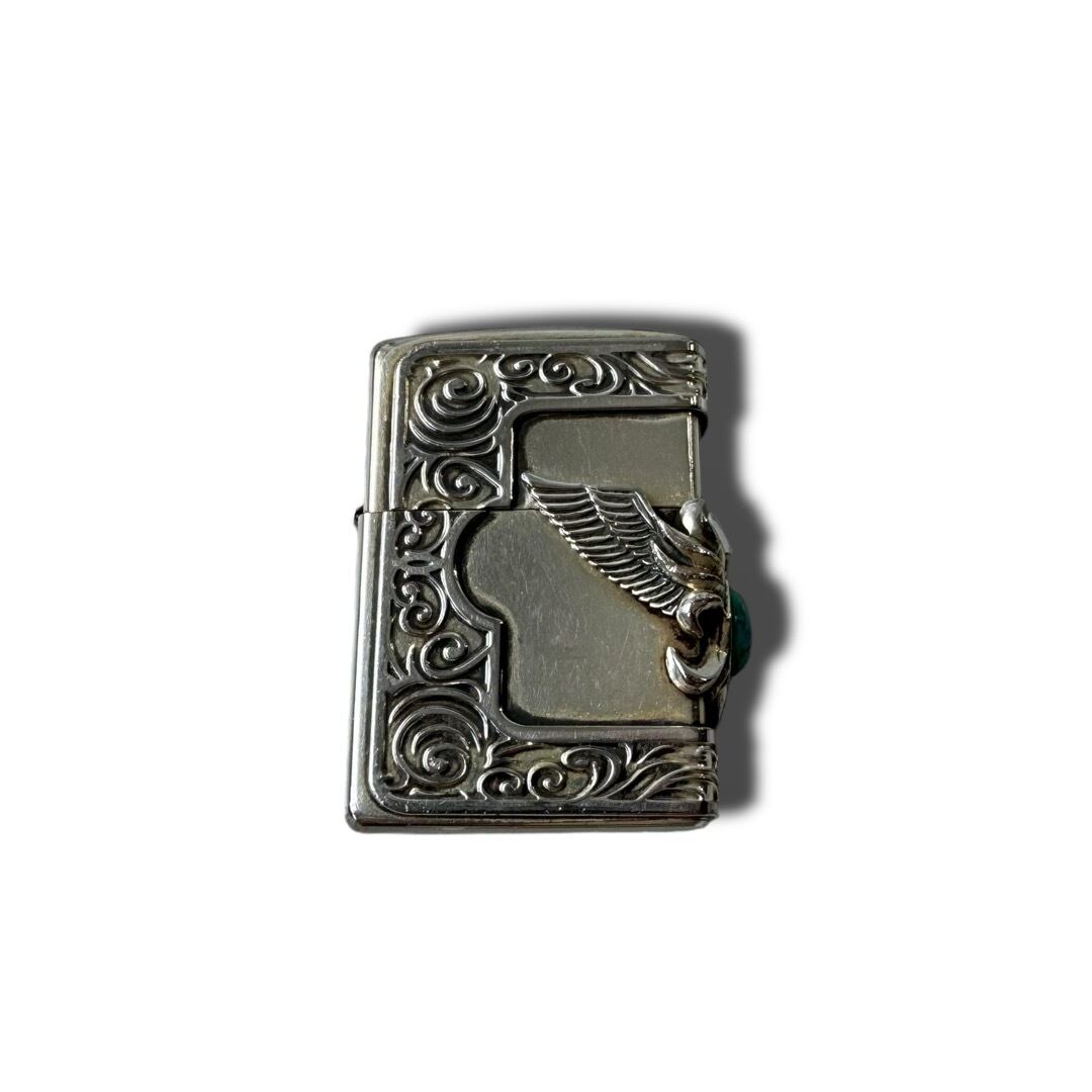 クールなモチーフに一石ターコイズブルーのストーンをセットしたデザインが特徴的なオイルジッポライター‼️