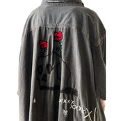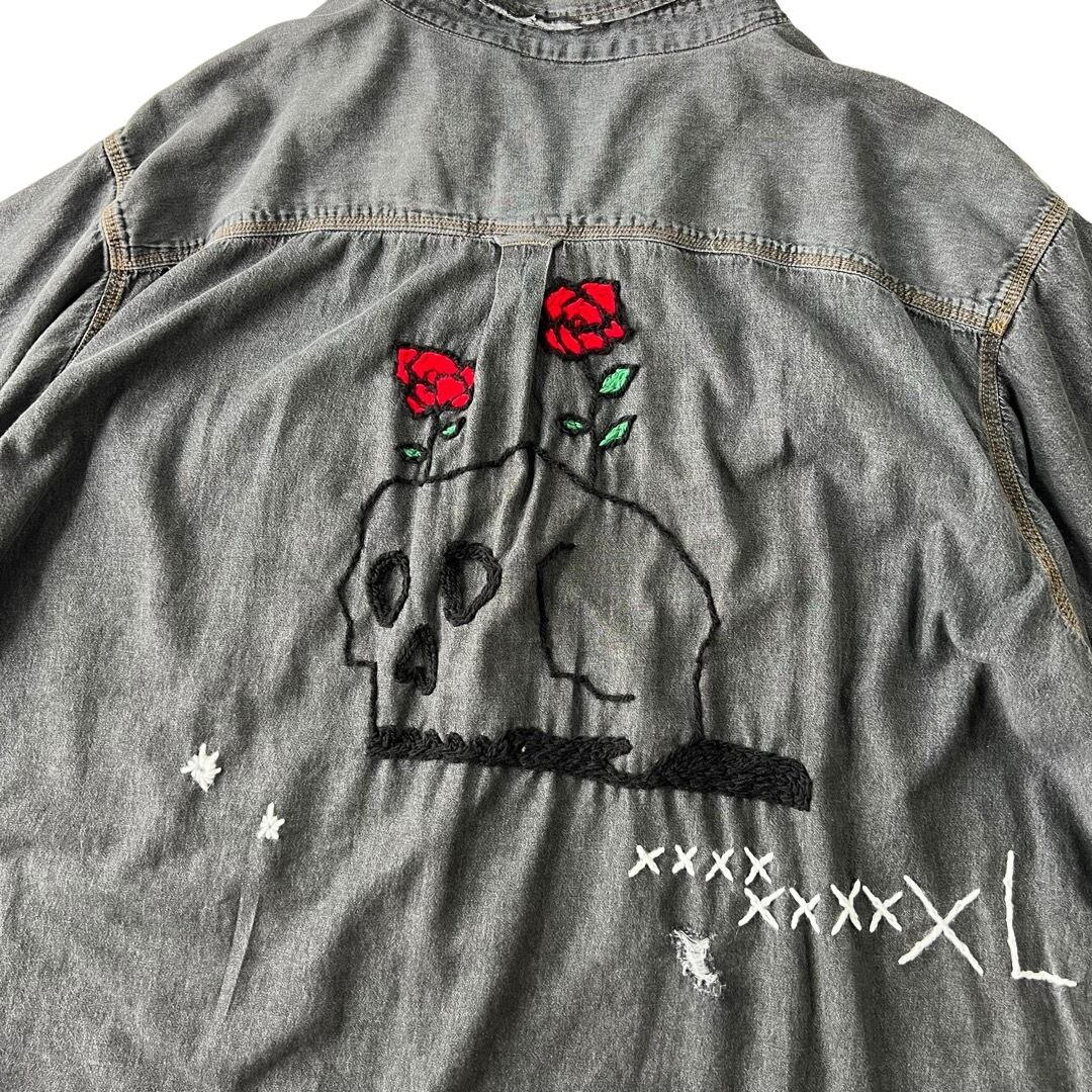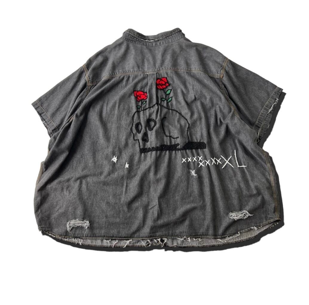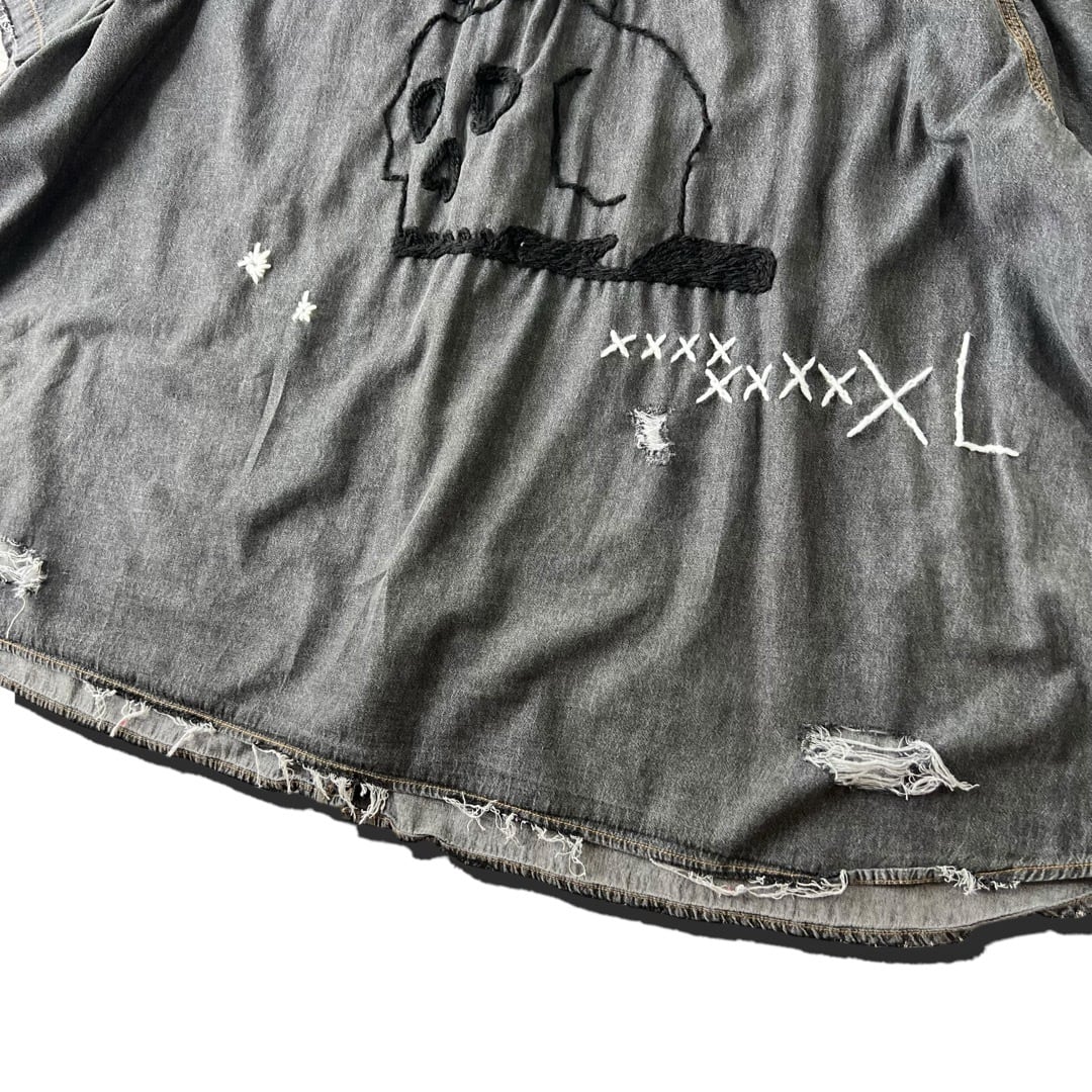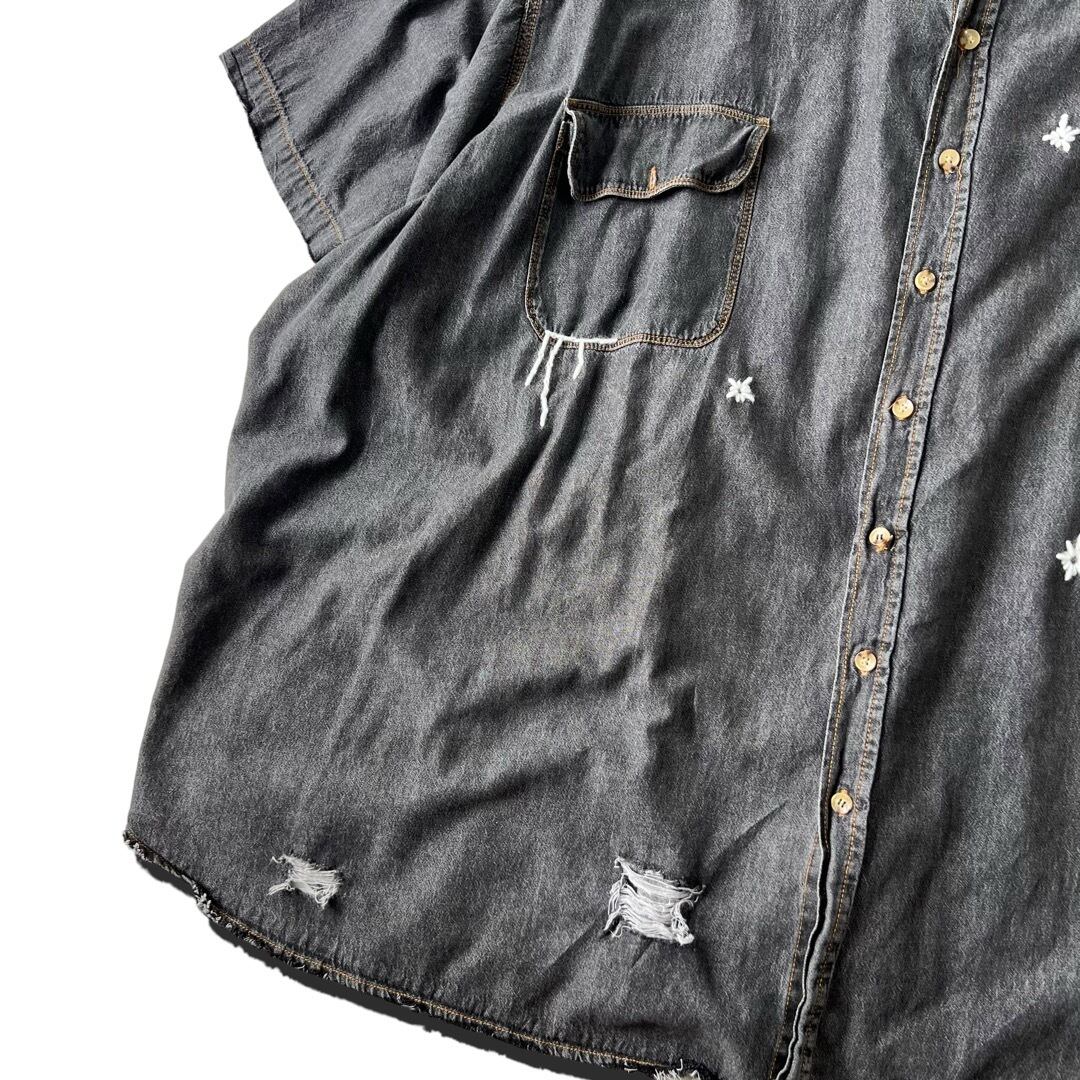 【90's KINGSIZE】 "Distressed Design" Stitch pattern Black Denim Shirt / size:9XL