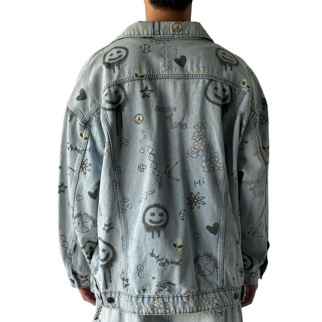 可愛げのある落書きハンドペインティングカスタムデザインが超クールなデニムトラッカージャケット。