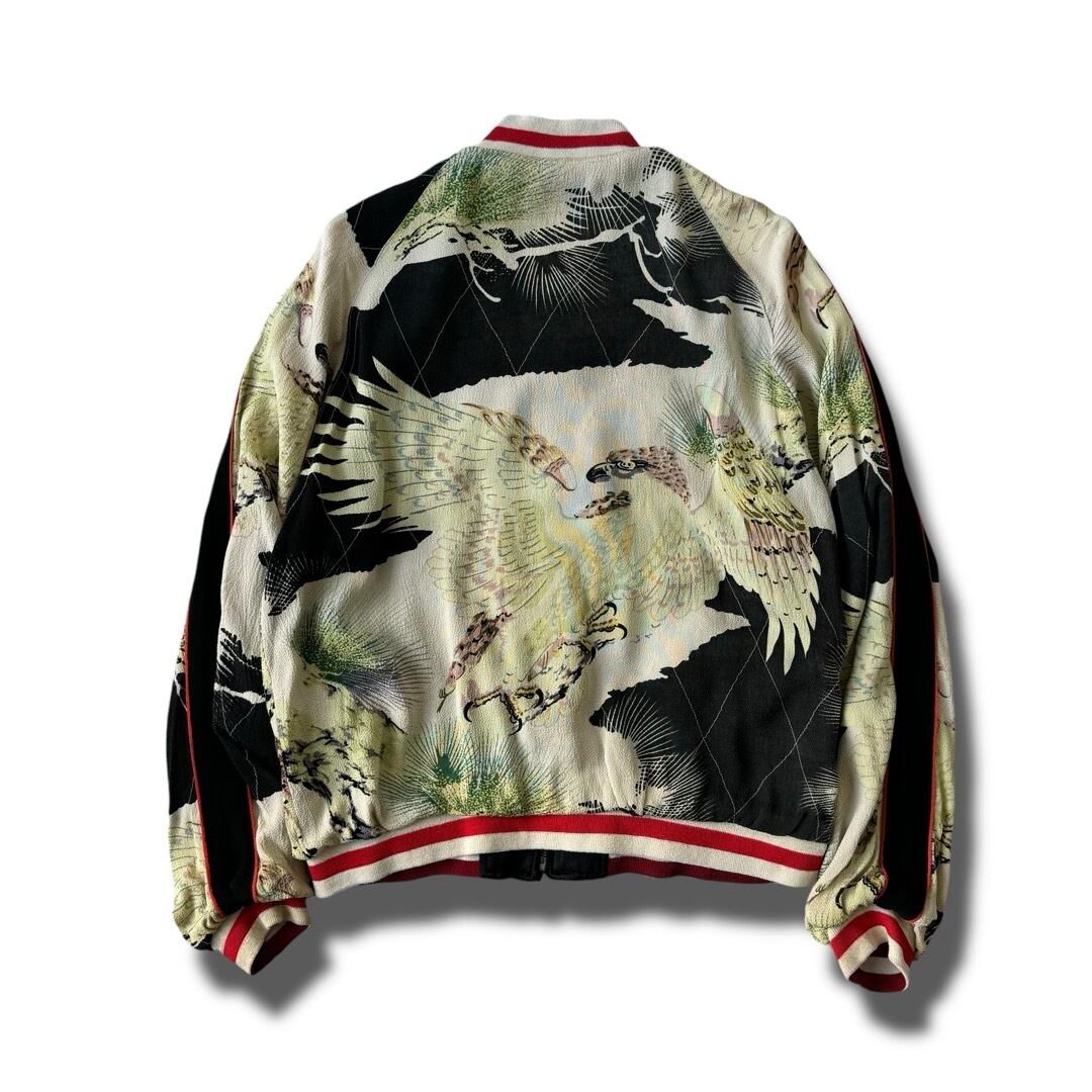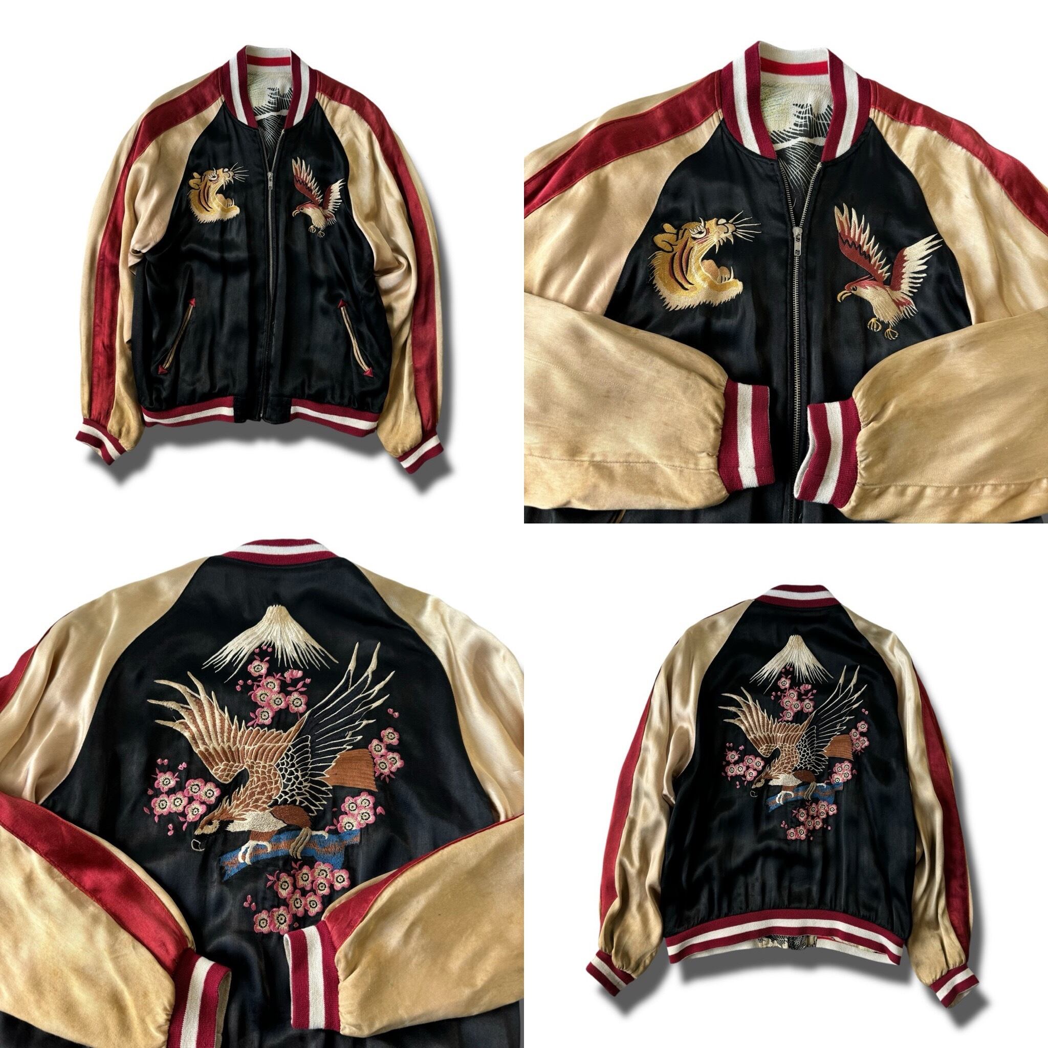 サテン面はこれぞスカジャンといった鷹と虎の胸刺繍と背面の富士山をバックに桜舞うイーグル刺繍✨