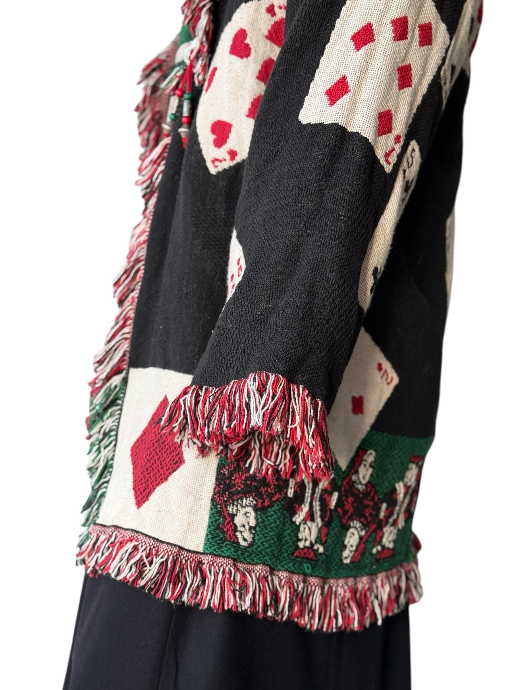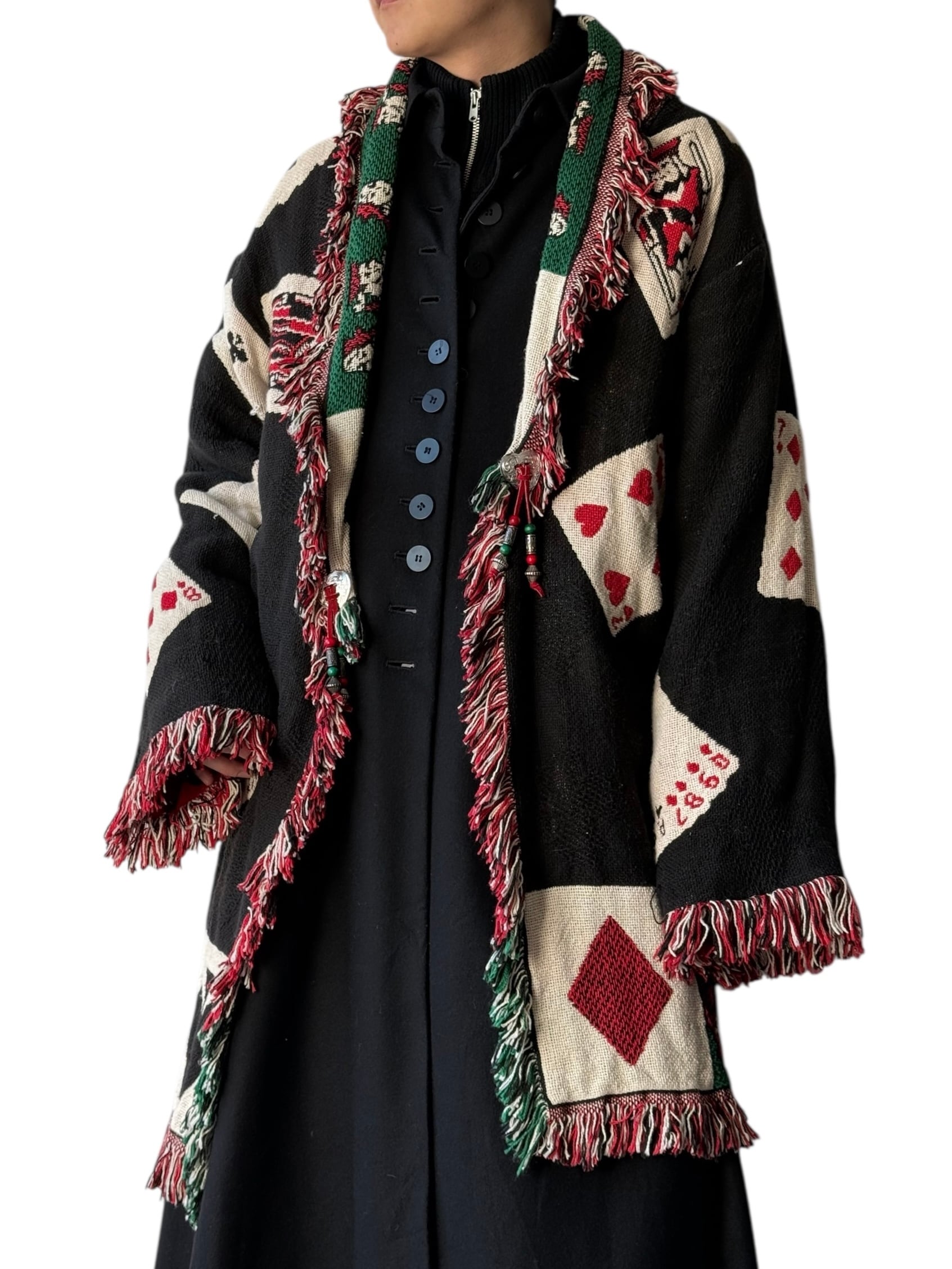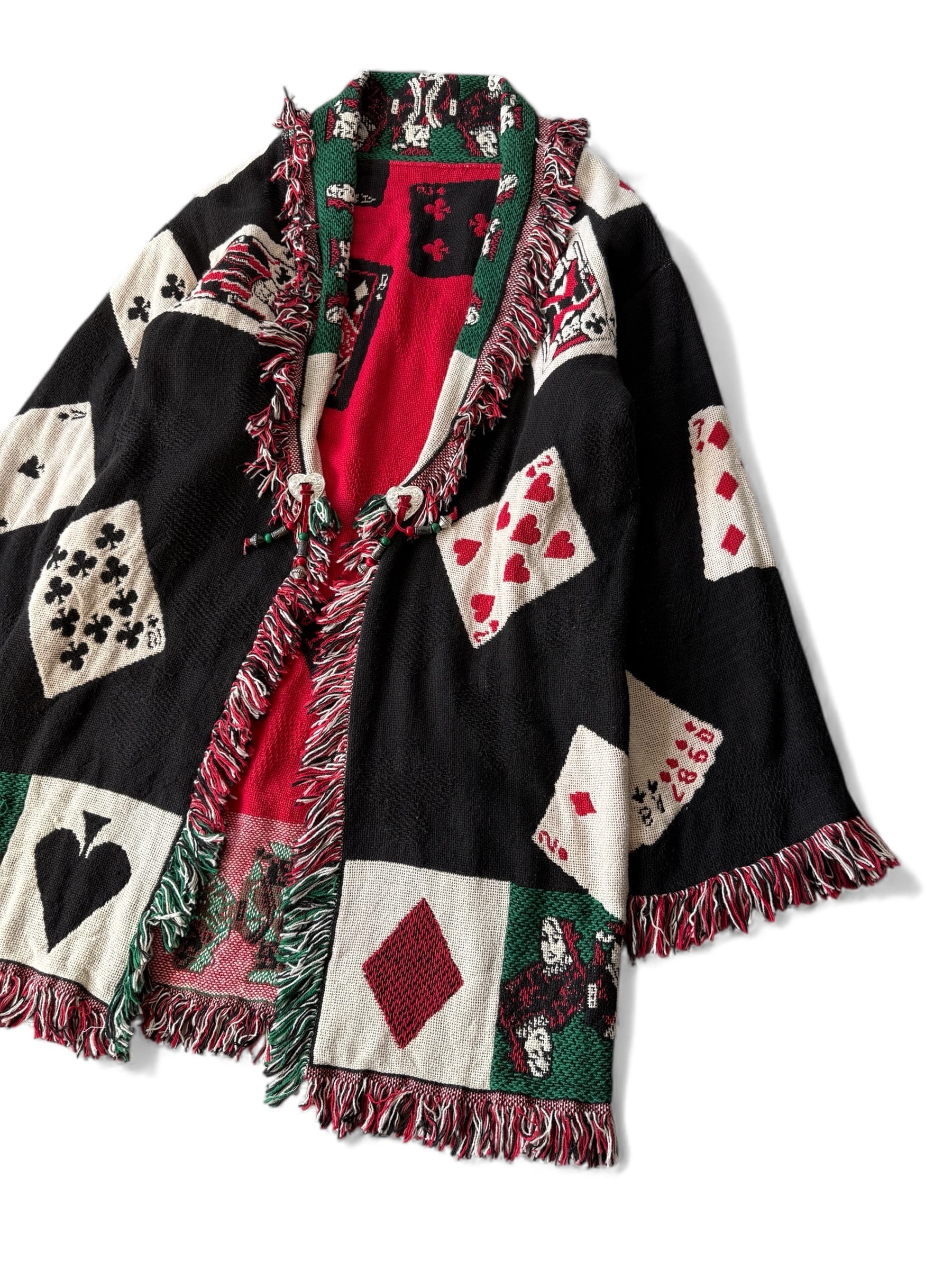 元となるそもそもが希少なトランプ柄はもちろん荒めのザックリとした生地とフリンジが圧倒的な存在感。