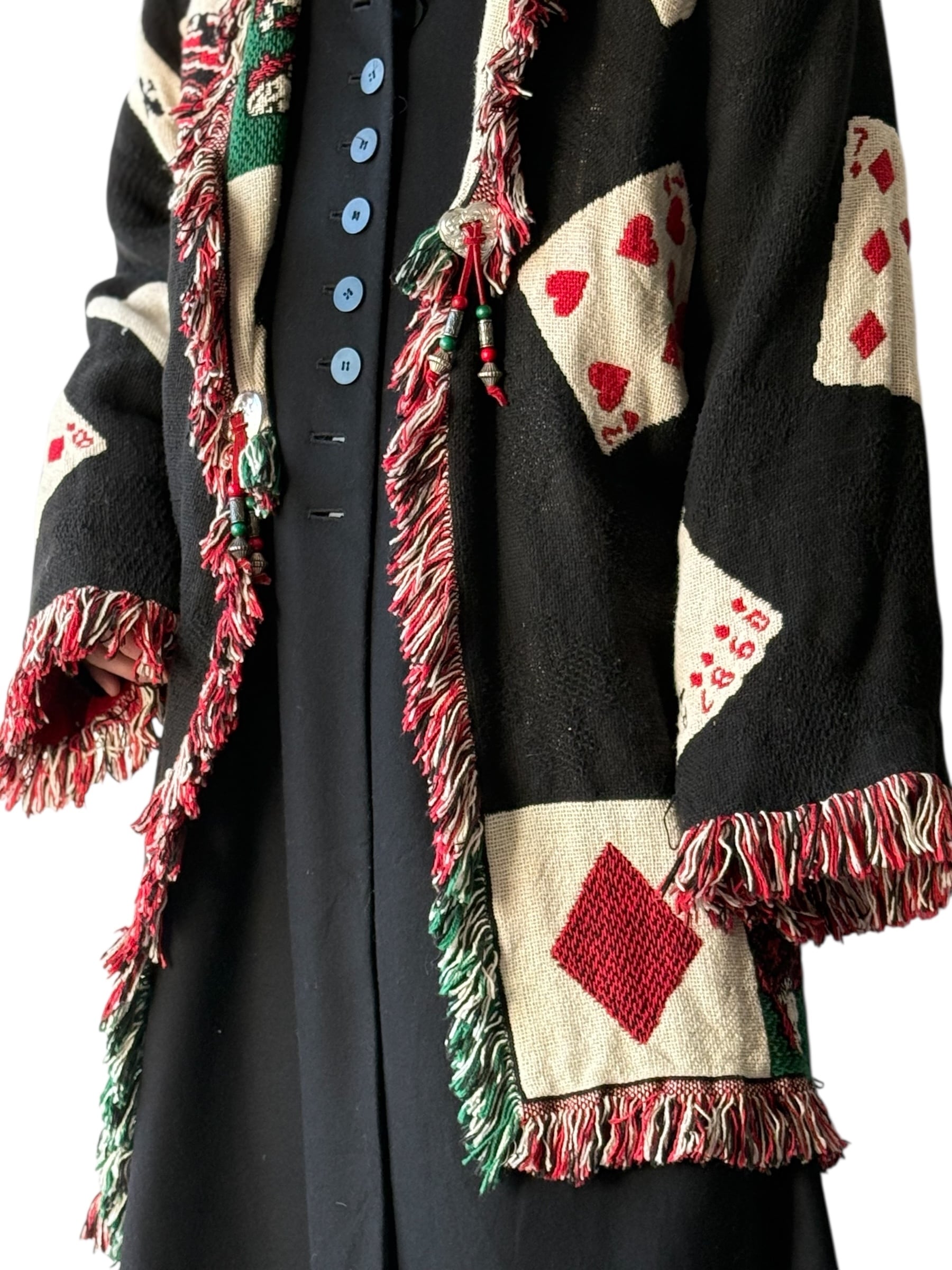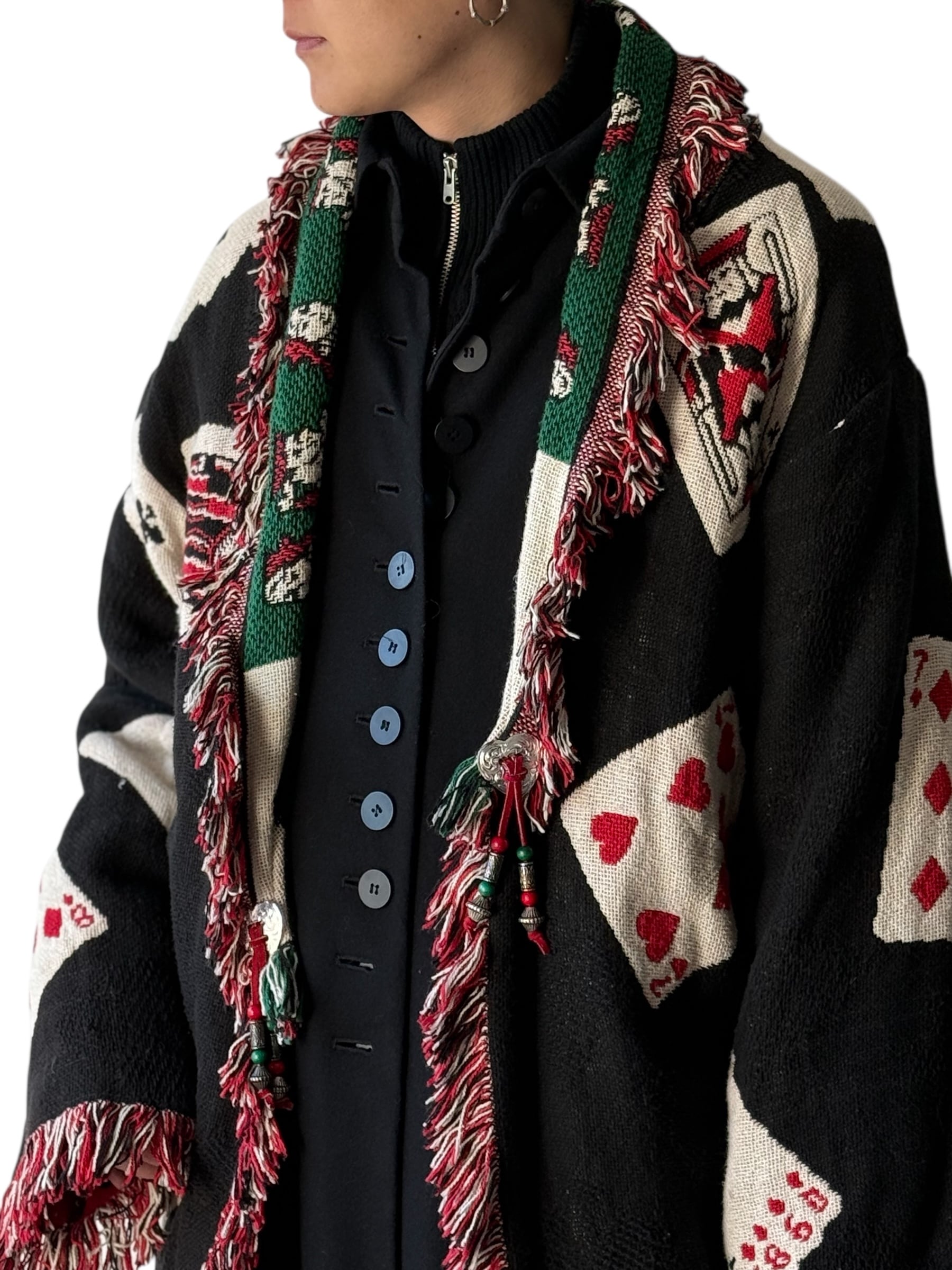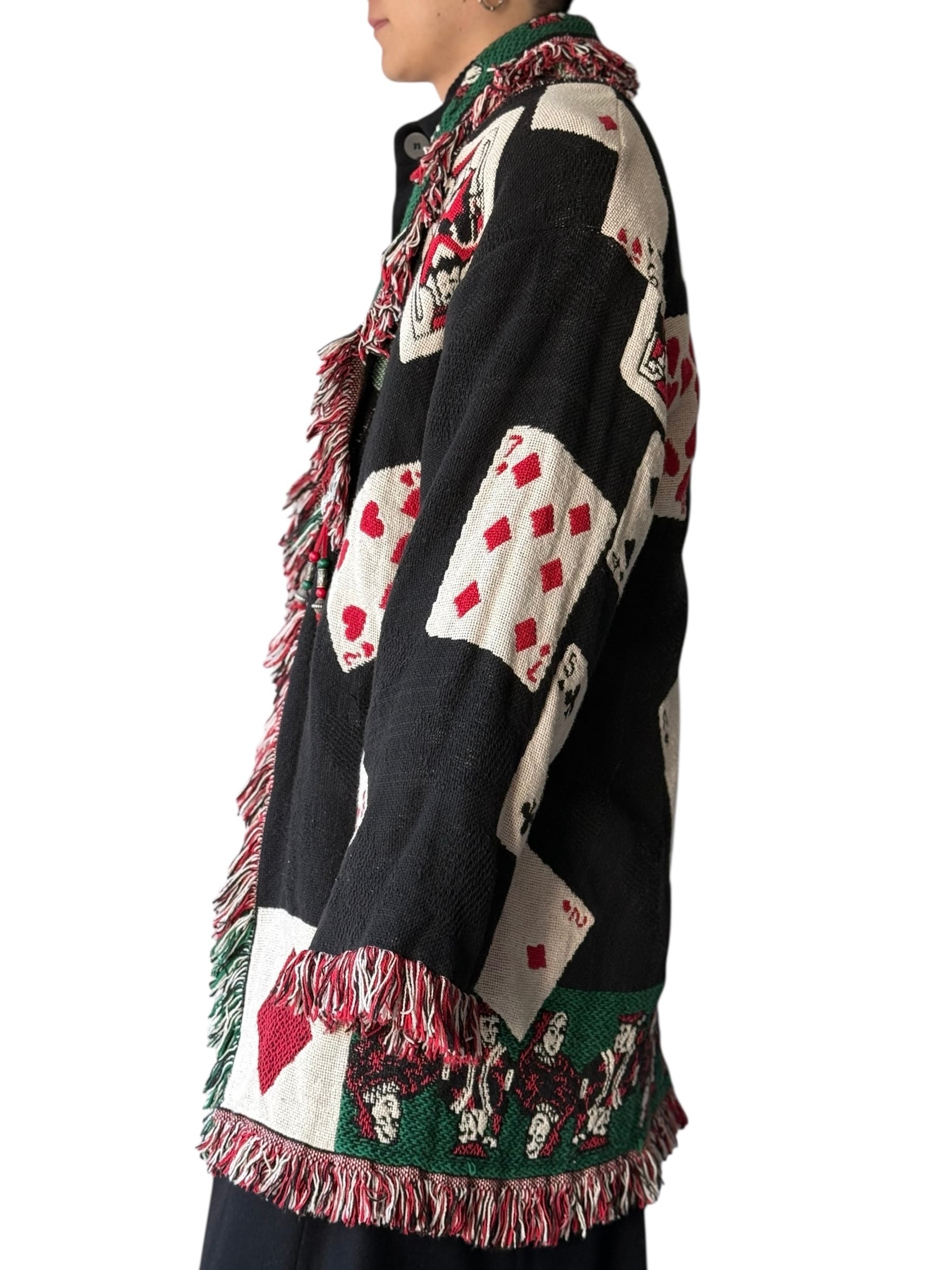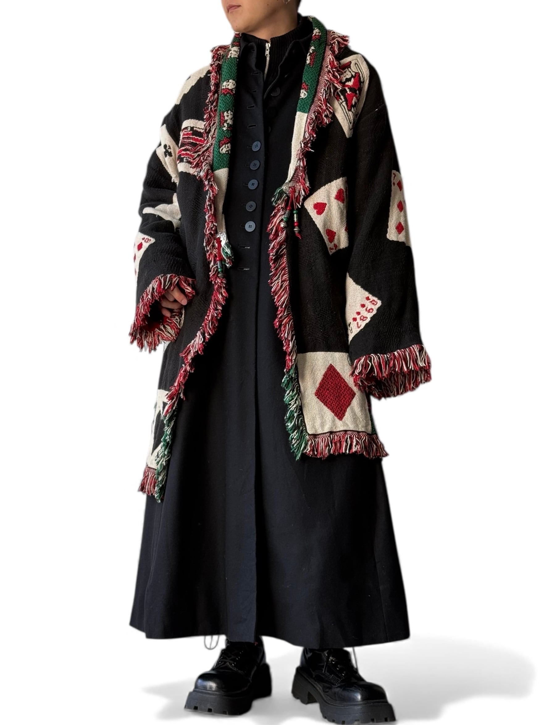 元となるそもそもが希少なトランプ柄はもちろん荒めのザックリとした生地とフリンジが圧倒的な存在感。